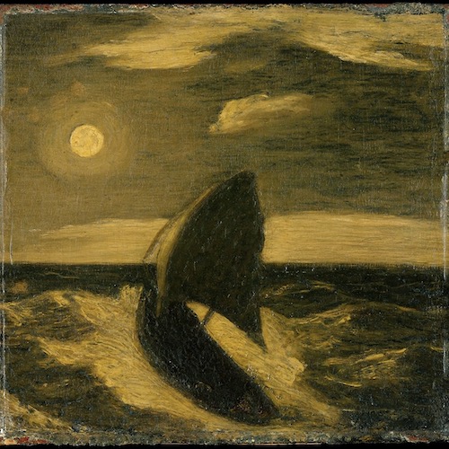 Encountering such paintings, one might feel like Ishmael in the third chapter of Moby Dick, published four years after Ryder was born. On his way to Nantucket to enlist on a whaling ship, Ishmael is stranded in New Bedford, where he looks for a bed at the louche Spouter-Inn. In the entryway hangs a large oil painting “so thoroughly besmoked, and every way defaced” that Ishmael wonders whether “some ambitious young artist…had endeavored to delineate chaos bewitched.” Peering more closely at the “boggy, soggy, squitchy picture”—depicting a doomed whale hunt, as it turns out—Ishmael revises his opinion: “Yet was there a sort of indefinite, half-attained, unimaginable sublimity about it that fairly froze you to it, till you involuntarily took an oath with yourself to find out what that marvellous painting meant.” Many of Ryder’s paintings, because of his own risky practices or the depredations of time, can seem besmirched and defaced almost beyond recognition. But on sustained inspection these bewitching pictures can inspire the same mood described in Melville’s double take: an uncanny sense of the sublime and a determination to uncover their enigmatic meaning.