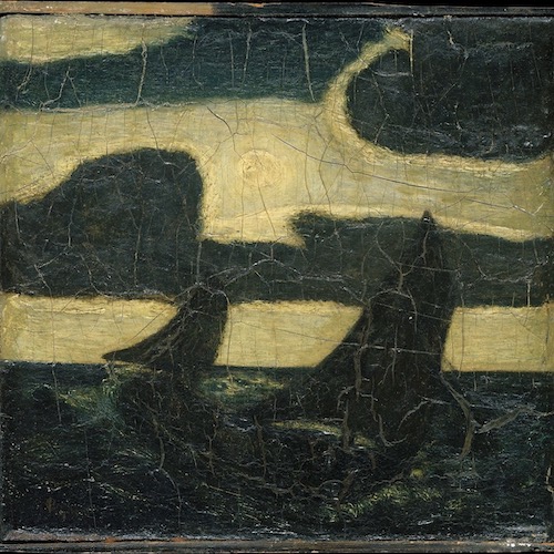 Encountering such paintings, one might feel like Ishmael in the third chapter of Moby Dick, published four years after Ryder was born. On his way to Nantucket to enlist on a whaling ship, Ishmael is stranded in New Bedford, where he looks for a bed at the louche Spouter-Inn. In the entryway hangs a large oil painting “so thoroughly besmoked, and every way defaced” that Ishmael wonders whether “some ambitious young artist…had endeavored to delineate chaos bewitched.” Peering more closely at the “boggy, soggy, squitchy picture”—depicting a doomed whale hunt, as it turns out—Ishmael revises his opinion: “Yet was there a sort of indefinite, half-attained, unimaginable sublimity about it that fairly froze you to it, till you involuntarily took an oath with yourself to find out what that marvellous painting meant.” Many of Ryder’s paintings, because of his own risky practices or the depredations of time, can seem besmirched and defaced almost beyond recognition. But on sustained inspection these bewitching pictures can inspire the same mood described in Melville’s double take: an uncanny sense of the sublime and a determination to uncover their enigmatic meaning.