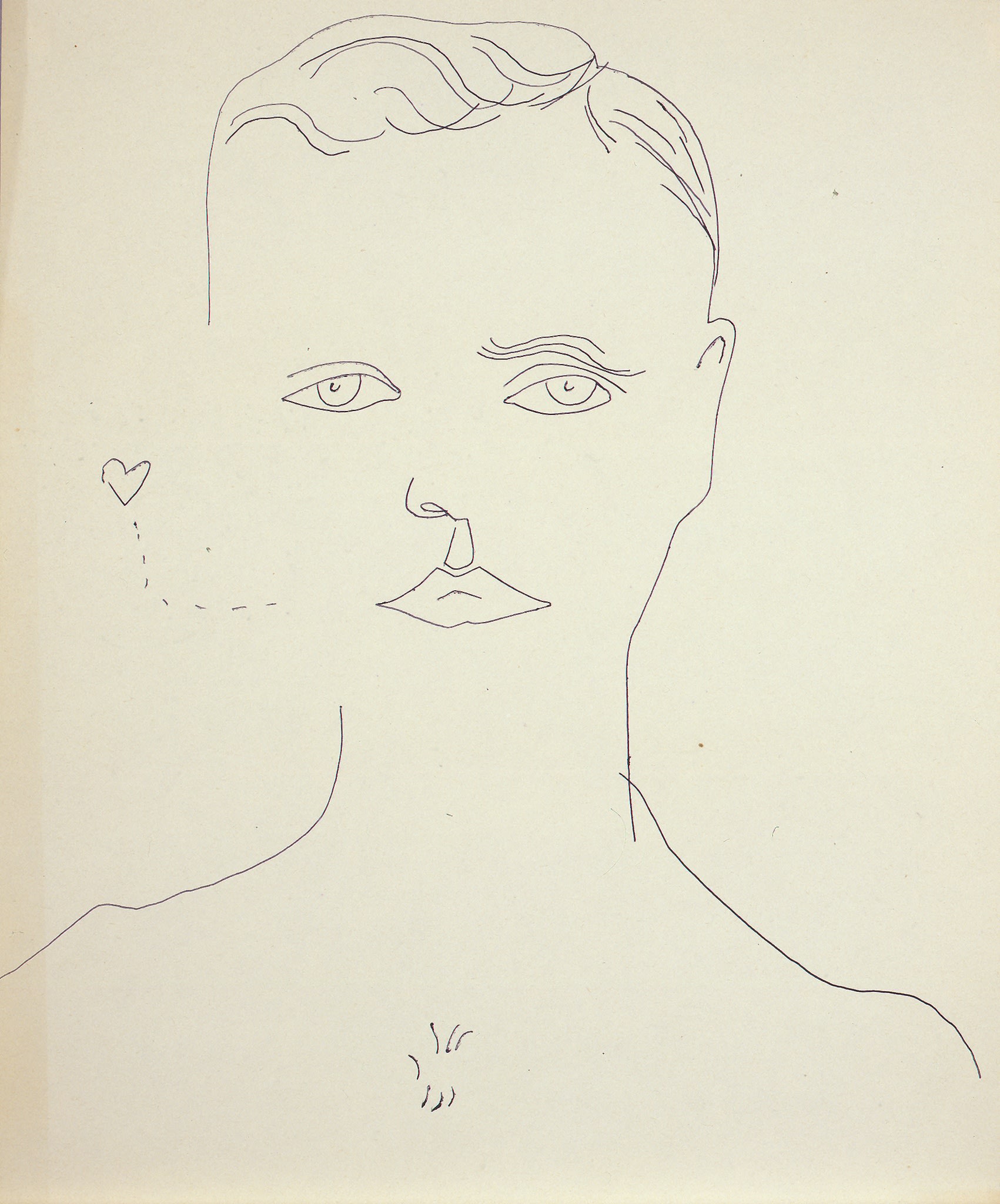 There is nothing “Factory” about this work, done for Warhol’s private pleasure and thus possibly the most hands-on of his oeuvre. These are purely personal creations, rather than the celebrated creations of Warhol’s brilliantly devised personna. Generations of art students, following Warhol’s lead, thought they could become artists without ever learning to draw. Warhol clearly enjoyed drawing, and in its subtle way, it underpins his inimitably innovative media manipulation. In his drawing practice he played not only with subject matter that recurred throughout his career (celebrity; self-portraits; commercial products) but experimented with different drawing techniques — utilizing ballpoint pen, blotted lines, graphite and acrylic paint.