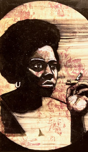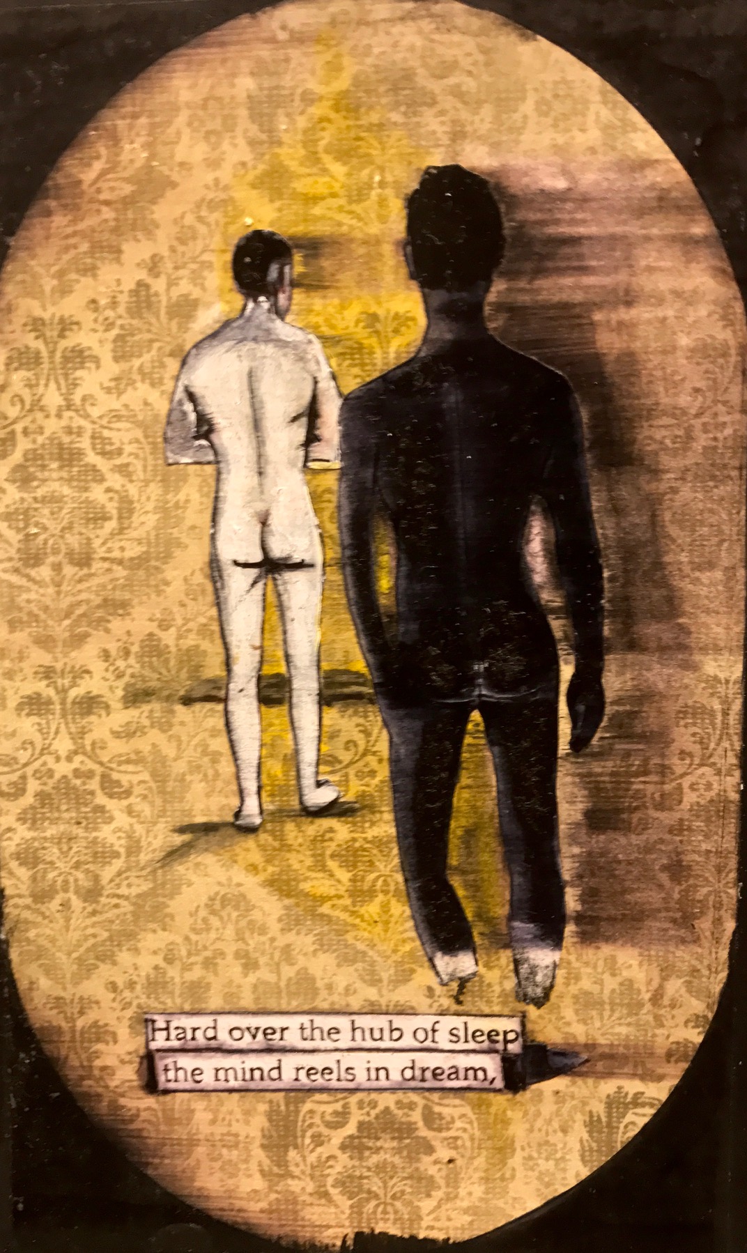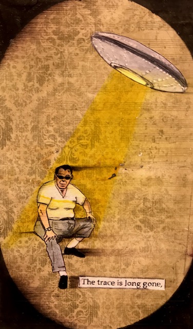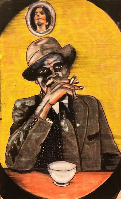 Not unlike tin scraps gathered, then painstakingly crafted and painted into ex-voto offerings under the dim flicker of propane lamps in the outer rings of Mexico City, Antigua, or Salvador, and not unlike the mid-century Beat “cut-ups” of William S. Burroughs scattered like lotus petals on a mosaic tiled floor in the junk-sick dawn of Tangiers, and not unlike the embroidered Ayahuasca-dreamt songlines of the Amazonian Shipibo, Anthony Hassett’s pen, ink and glaze drawings in Japanese Moleskin albums are rhythms of a history at once autobiographical and universal: poetic calling cards shuffled and laid bare in a line by an adept renderer’s hand that has the strength and fury of a fighter’s fist combined with the mystical empathy of a Stigmata.