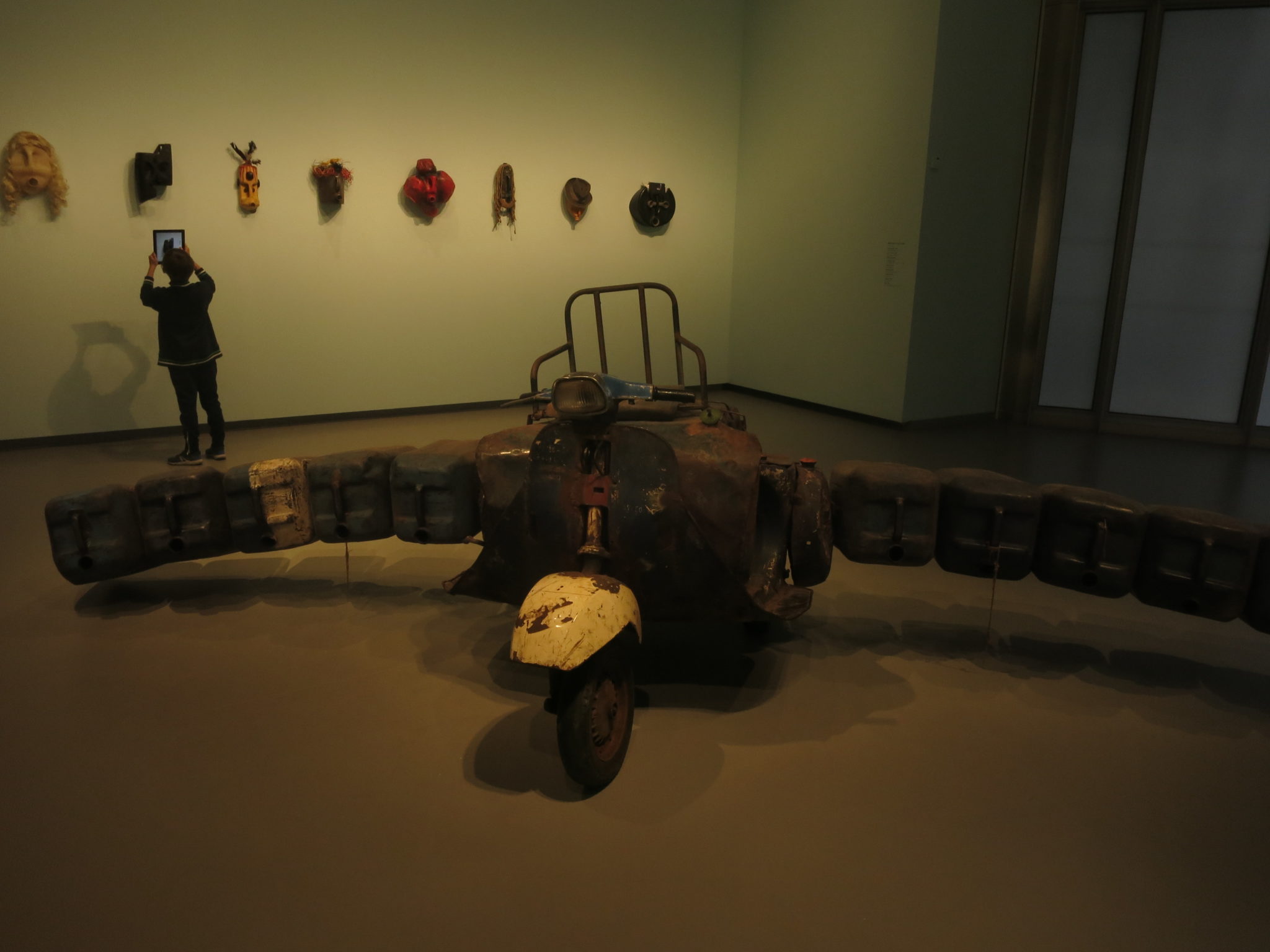 While hairstyle and tattoos are a cultural language most Africans are fluent in, Western audiences comfortably identify masks as a form of African art. Romuald Hazoumè, an artist from Bénin, fashions them from recycled materials. His simple and bluntly expressive shapes, as well as the combination of traditional art and political intent, have found favor in the West. Hazoumè, who shows extensively and has garnered many prestigious awards, states in the exhibition’s video interview, “My way of communicating with Western audiences is to explain what it is like to be African today. The West sends its plastic trash to Africa where it is recycled into oil cans, which in turn litter our streets.” He becomes more emotional when he comments on his Cargo (2006), a scooter carrying a precariously lethal load of oil cans. “In Bénin,” he says, “people cross the border on scooter to traffic oil cans that constantly risk exploding. They know they might die, but feeding their family comes first. My art is inspired by these people living perpetually in danger.