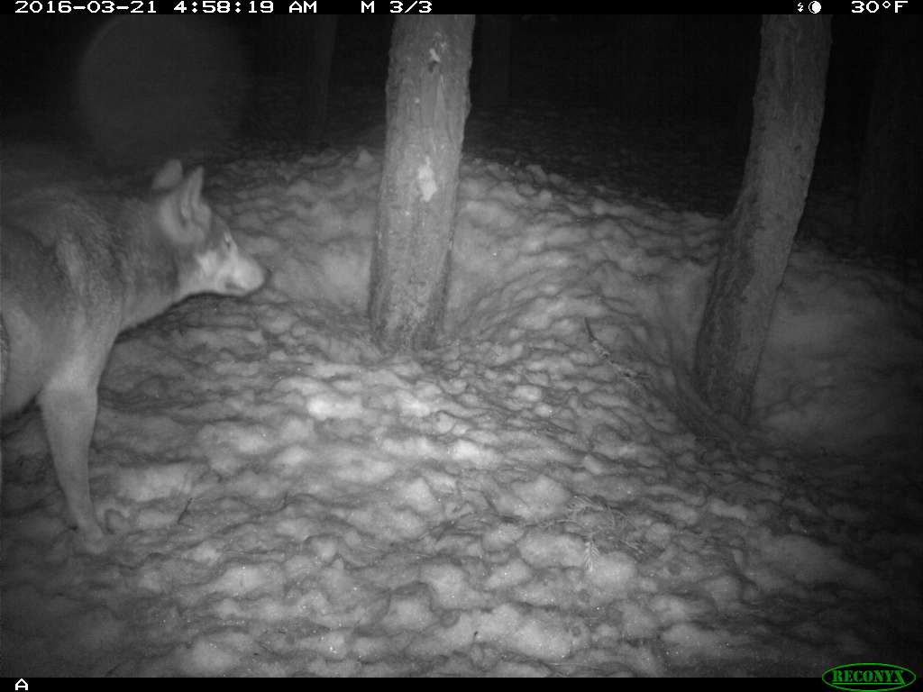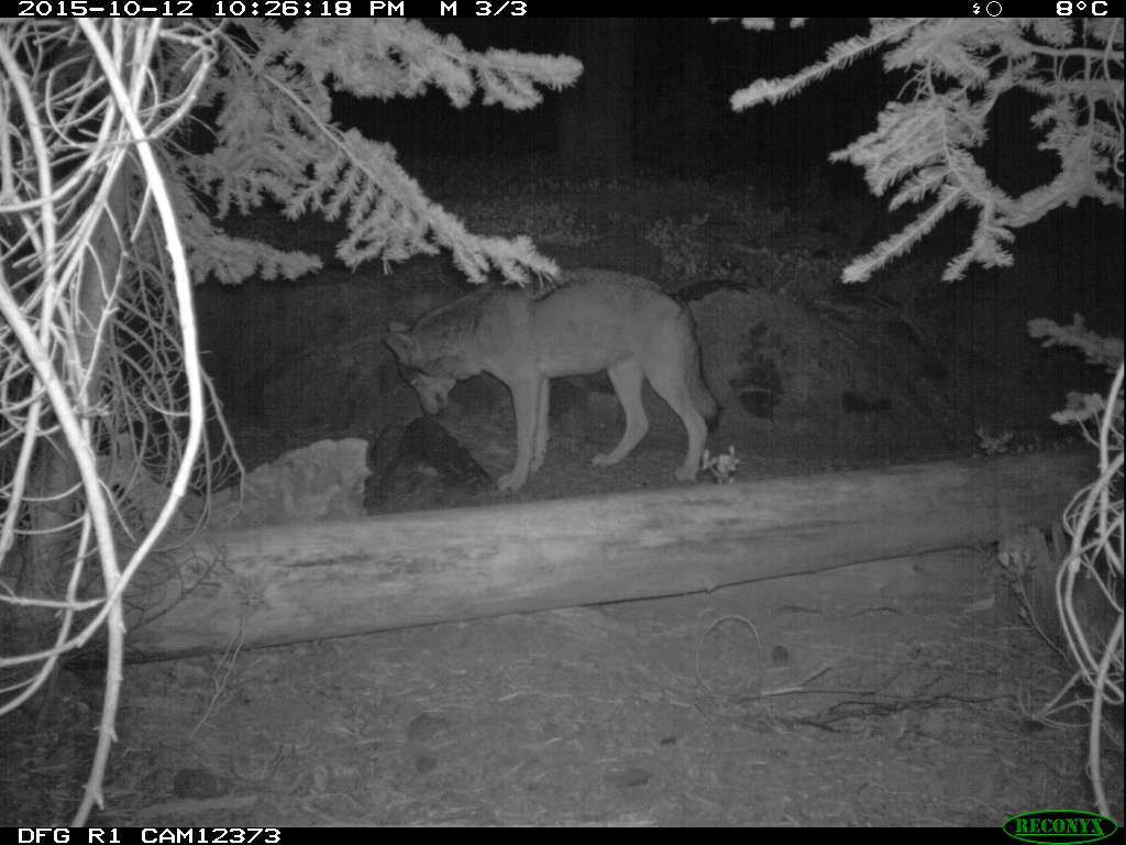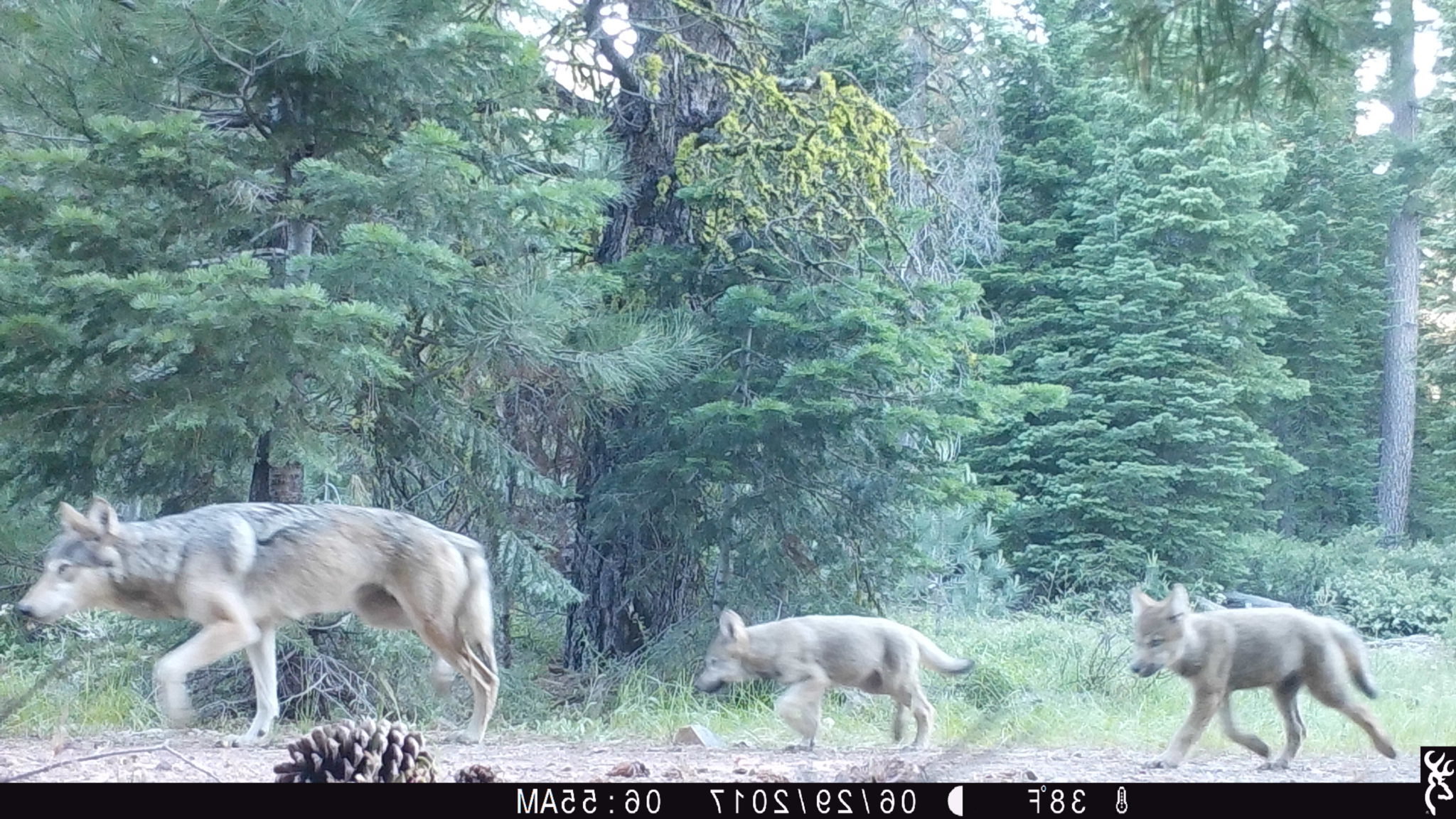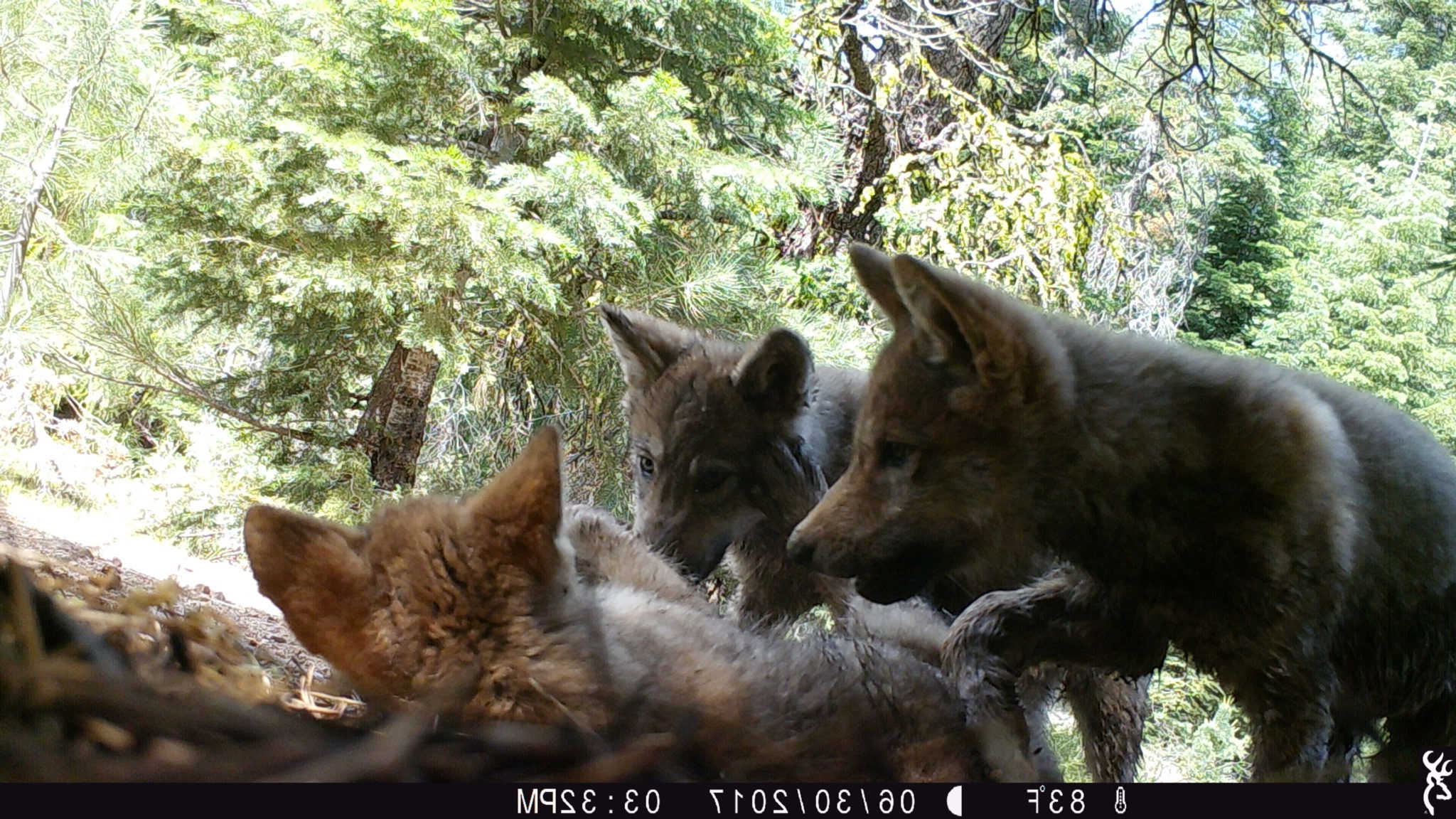 The following day, July 1, CDFW biologists returned to the field for a routine follow-up check on the female. They encountered tracks of what appeared to be wolf pups, and then found that a nearby trail camera operated by USFS had captured photos of the female with three pups. The pups were gray in color and were serendipitously photographed playing in front of the camera.