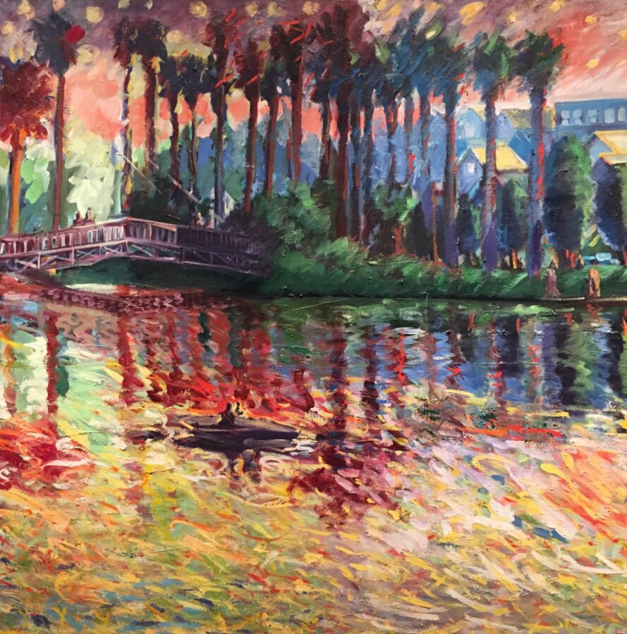 The 1988 painting entitled “California Native” (oil on canvas), one of the many pieces Cheech Marin lent to the show, continues this sense of unease – not strange when you realize Almaraz must have been quite ill by then. Again the picture plane from the top to the bottom is crammed with people, animals and mysterious watchful figures. The composition seems to be affected by centrifugal force, with the right side pulled to the right and the left side pulled to the left, leaving the center to seemingly slide and/or implode. To the left are two nude brown-skinned figures (a virtual Adam and Eve) painted in a way that suggests Gauguin’s use of color and Tahitian subject matter. To the right, a farmer holding a rooster is painted with sectional lines that delineate the form and remind of both Almaraz’s own pastel drawings and also Degas’ pastels. Once more, there is a bridge (over troubled waters?) motif as the water slides perilously towards a house and foliage fostering a sense of dread. A mysterious dark figure, simplified like Egyptian art, with the side eye facing us, impassively looks out over the whole hallucinogenic image.