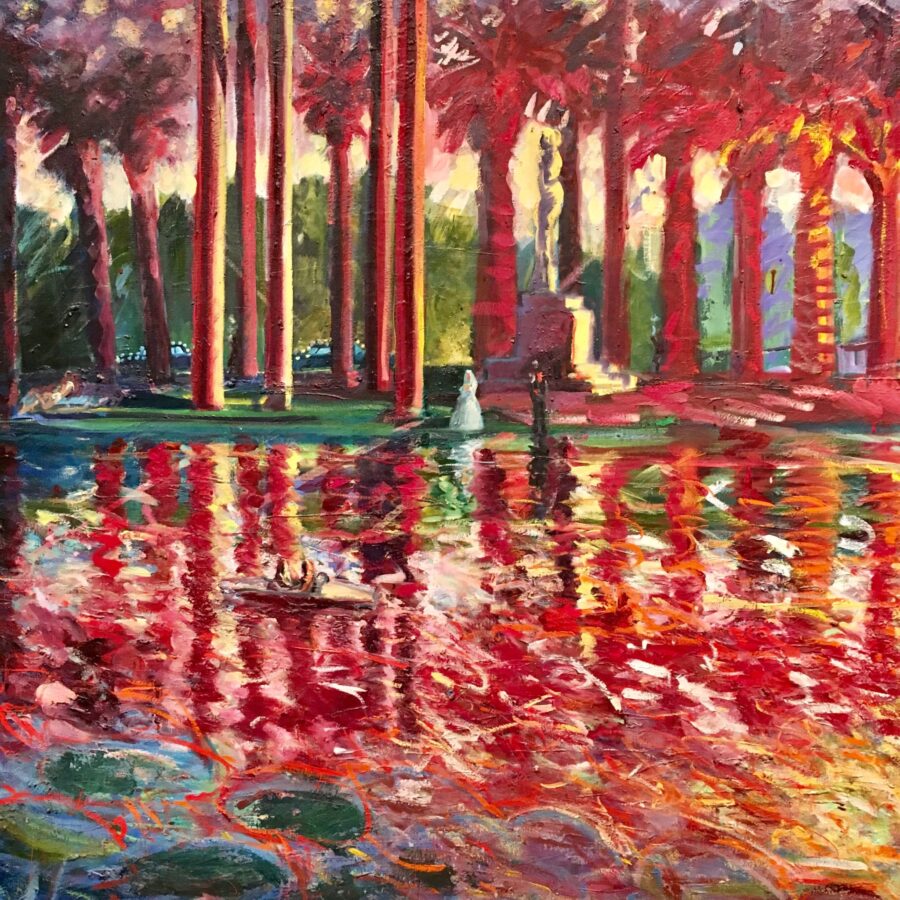 Almaraz’s early paintings are filled with mysterious and spiritual beings, such as women who are half-horse, half-human or rabbits whose shadow is in the moon. Like the literary Latin American movement called magic realism, there is a tantalizing brew of the real, the imagined, the invented and the dreamed in all of his work. Although Almaraz came of age with the Chicano movement, and although he and his comrades painted similar motifs, Almaraz’s work was always darker. Even his iconic four-part image of Echo Park series painted in 1982 seems like a feverish dream or hallucination. The red of the sunset almost look like flames licking the bark of the palm trees.