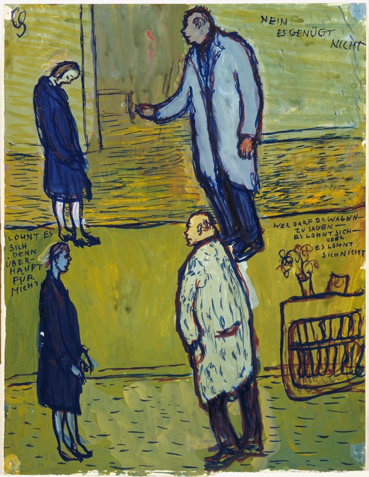 Finally, there is that hoary old question of gender. It has always been easier for women to enter museums in the nude than clothed and wielding a paintbrush. The gender imbalance is gradually shifting, and Salomon’s legacy has taken on new weight. Feminist scholars have helped greatly here.[2] Yet it’s not altogether clear how interpreting Salomon’s work to present her, and perhaps her mother and aunt, as victims of (grandparental) sexual abuse deepens our understanding of her art or of a history mired in racism and persecution. Suicide was indeed more prevalent among Jewish women in Berlin than Jewish men, but Protestants and Catholics were not far behind: newspapers spoke of a suicide epidemic in urban society as a whole. The horrors of World War I and its aftermath—mass unemployment, a horrible death toll, the wounded ever visible in the streets—contributed to the epidemic. For women who wanted freedom and for whom that desire already produced inner conflict, patriarchal prohibitions—more vociferously expressed because of the evident crisis in masculinity—were an extra burden. Adding sexual abuse to the mountain of ills for the women in the Salomon maternal line merely reduces Charlotte’s suicidal impulse (which was shared by men in the family) to a single hypothetical cause.
