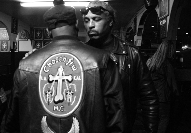 And then in 2011 I decided that I wanted to do something with the Chosen Few. So I said, I want to organize a big ride with them and I want to take pictures and I want to document it. There were like 150 guys and we went on the freeway from South Central to Downtown L.A. and back to the club. And then they started telling me stories. There was a friend of mine who worked on the film with me. So we start documenting this, documenting that. Going back here, going there on Sunday, on Christmas, they are giving toys to the kids. And then suddenly the police went in and arrest nine people for drugs and shit like that. They lost the club house they had for 36 years. They were all going nuts. They had bad lawyers and they lost money. It’s all in the documentary.