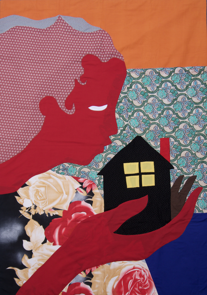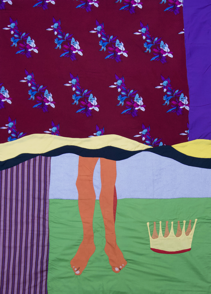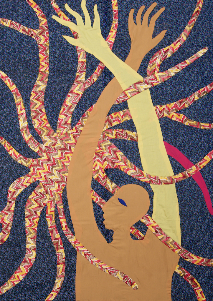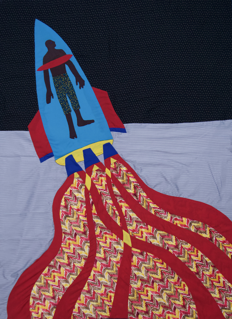 As a play-write as well as a visual artist, Myers is also keenly interested in the theatrical. In another, smaller scale series of textile works, he pays homage to performing icons. One, Waiting for No One, represents the world of Samuel Beckett’s Waiting for Godot, specifically a production Myers was involved with in New Orleans in which one of the play’s stars was actor Wendell Pierce. Of this section of the exhibition, the artist notes that works reference things he’s loved in the arts and theater, including everything from dance to Buster Keaton (Deadpan Buster). Myers’ rich literary background creates a vast series of references in his work, from history to film to obscure literary works, references such as a Senegalese film, an Afrofuturist film, a silent Japanese horror film, and a feminist Utopian story from 1905.