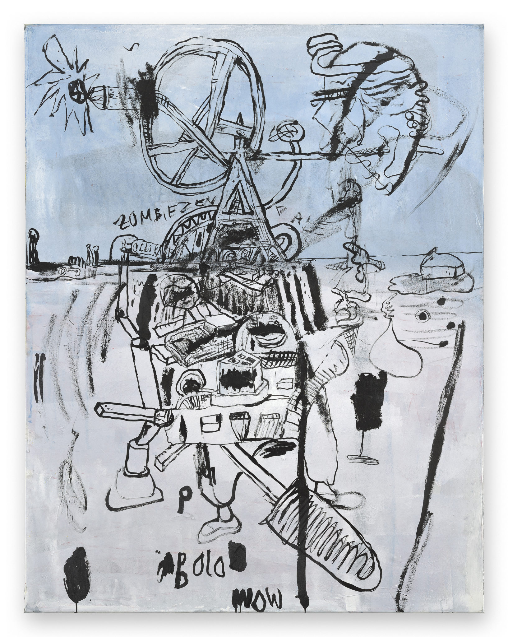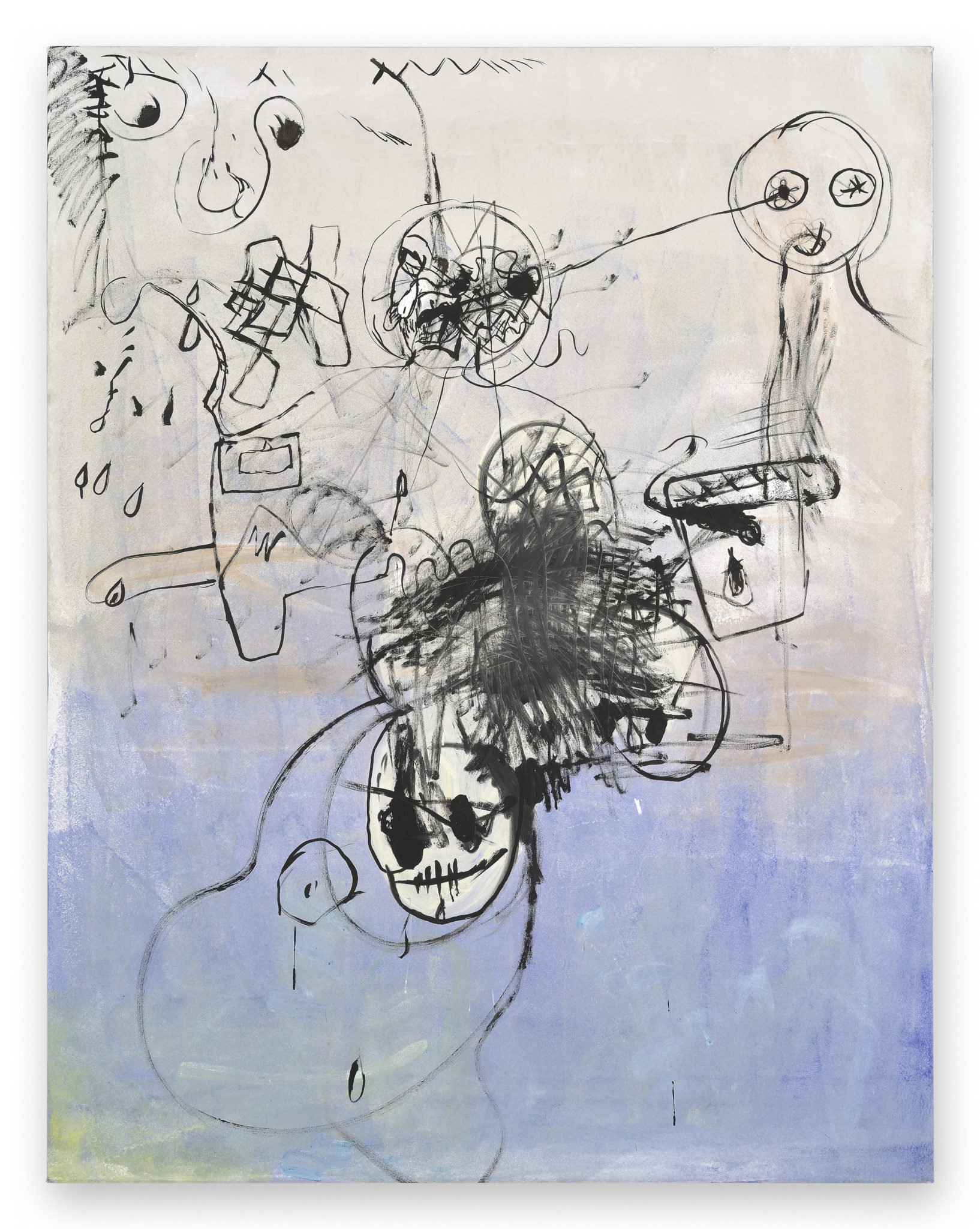 Point Blank is the title of the exhibition of four new paintings by Berlin based German painter Marcel Eichner (b. 1977, Siegburg, Germany) at James Fuentes Gallery, New York. In this show, Eichner works in acrylic and ink, with vigorous ink drawing and marks on broad washes of acrylic ground in pastel pinks and blues, and areas of white. These paintings mark the fulfillment of a new phase in Eichner’s approach to painting, since he has now moved away from his earlier idiom derived from the style of his mentor at Kunstakademie Düsseldorf, Jörg Immendorff. In his earlier work, Eichner emulated the piecework integration of figure and ground that is characteristic of Immendorff, an almost claustrophobic “interior-view” aesthetic so often found in the German Expressionist tradition.The broad spatial washes and ink painting found in these new canvases indicate Eichner’s looking now toward the lineage of pioneers of this drawing on ground approach found in the liberating graffiti-inspired paintings of Jean-Michel Basquiat. There is also some of the bite and manic humor we associate with Saul Steinberg to be found in Eichner’s work.
