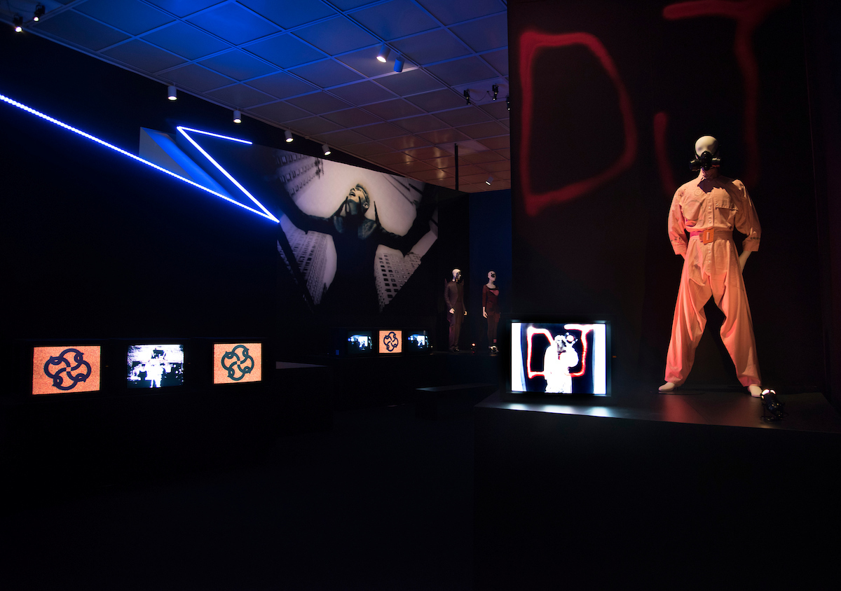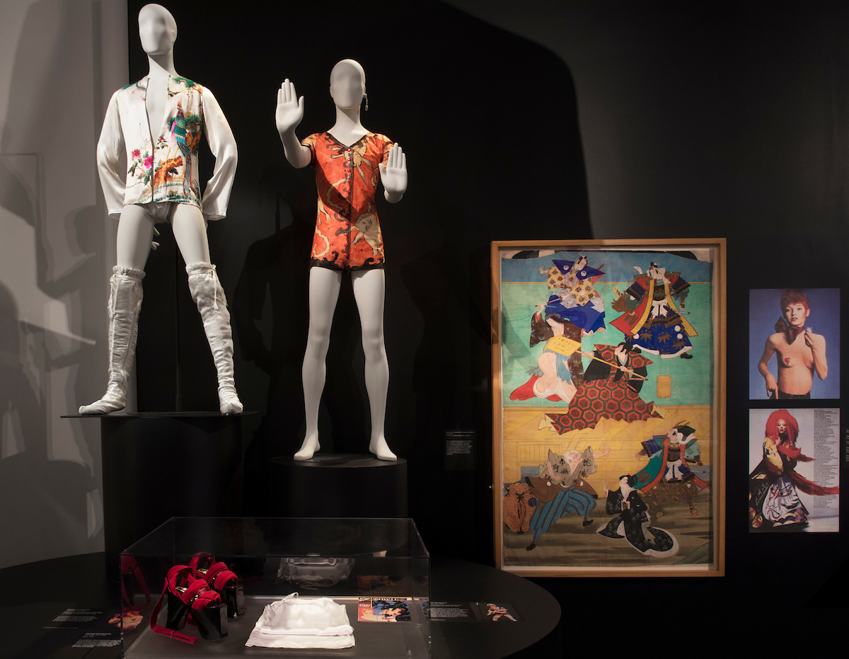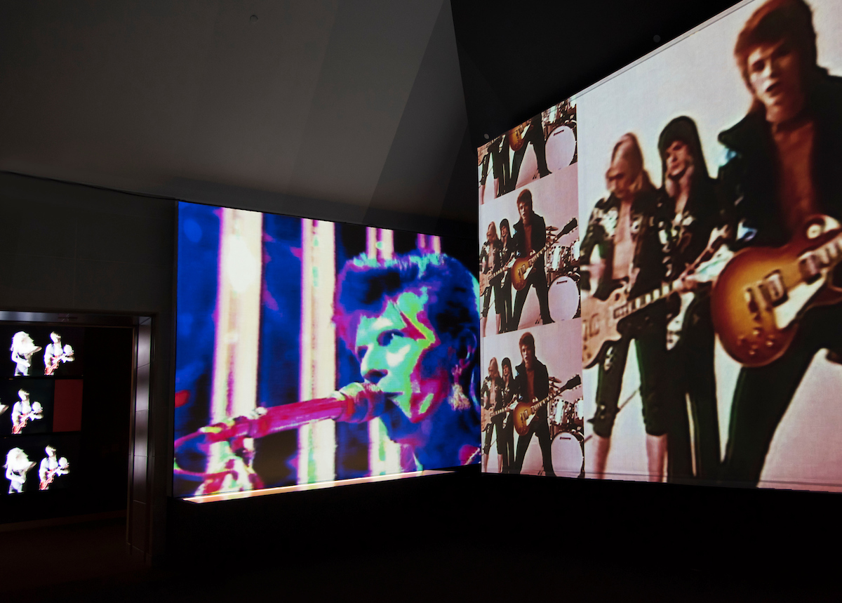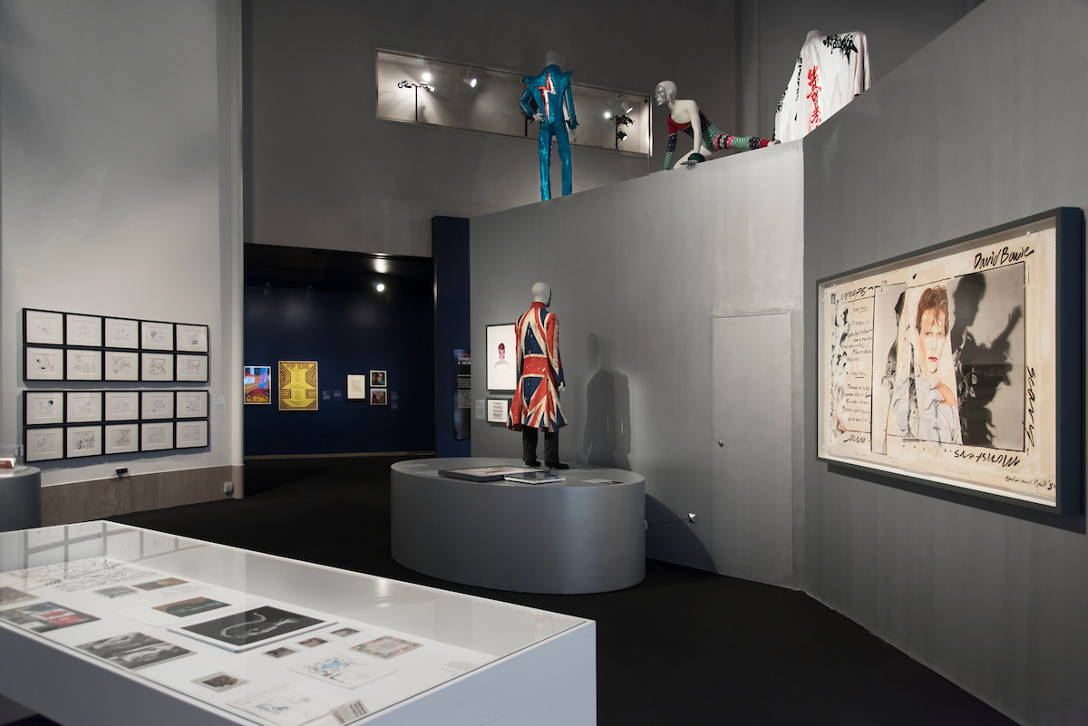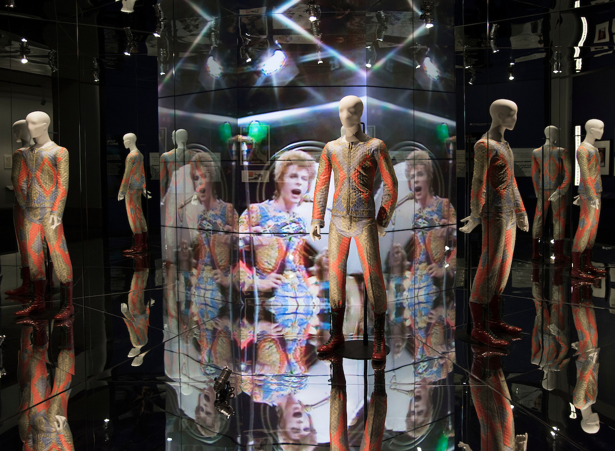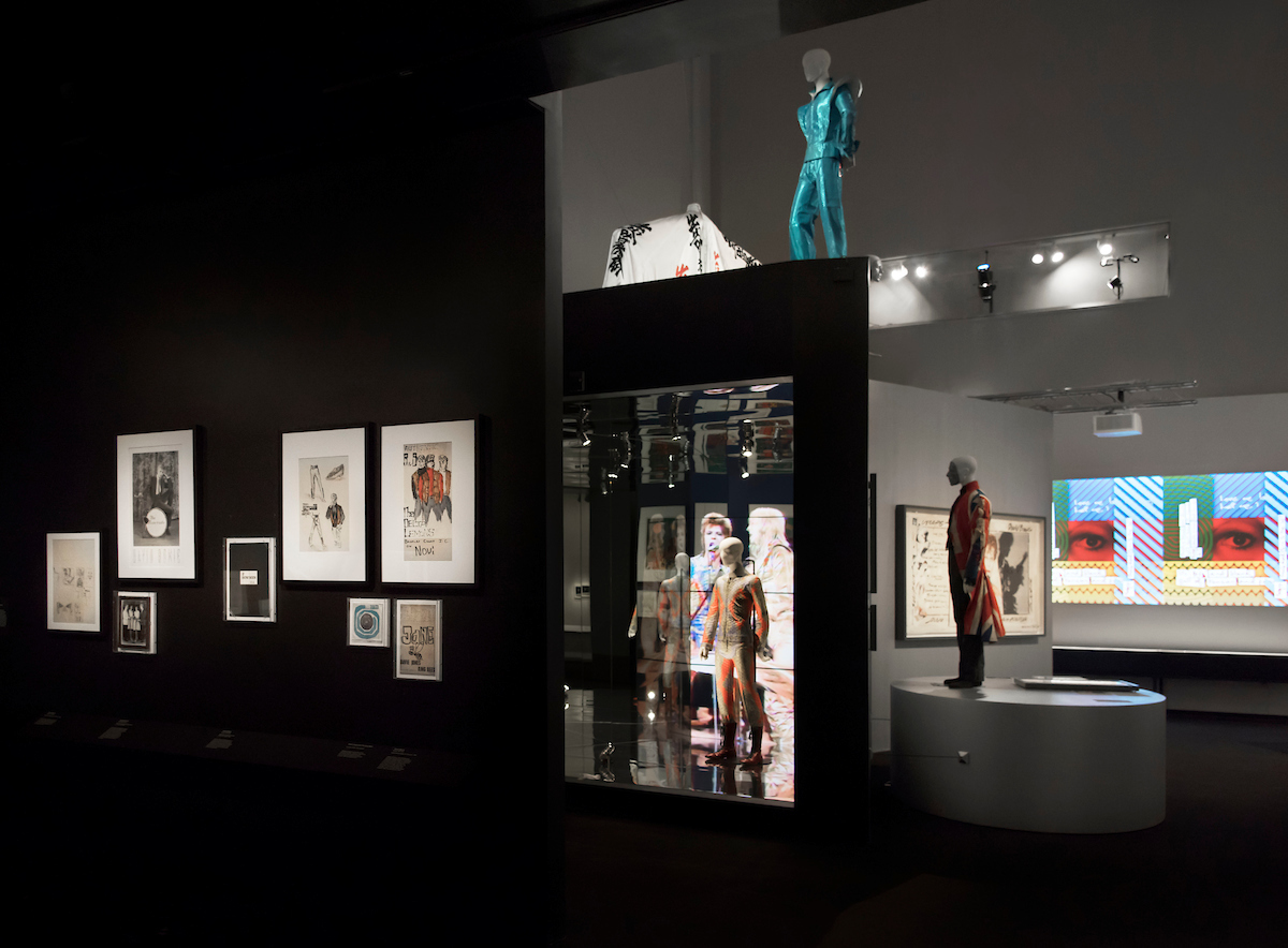 The show’s ability to echo the collaborative energy and experimental grit, which permeated through the many phases of Bowie’s career, is perhaps the exhibition’s biggest success. A particular peak from the exhibition’s display of 60 custom-designed costumes is the highlight of the work of renowned designer Kansai Yamamoto, who dressed the artist to perform as his supernatural androgynous alter-ego Ziggy Stardust and later stage persona Aladdin Sane. Deeply influenced by Japanese theatrical design and its foundation in extravagance and nonconformity, Yamamoto’s influence in the 1970’s largely shaped the aesthetic foundation of some of Bowie’s most iconic moments. Additionally, the story of his 1996 Union Jack coat co-designed with Alexander McQueen also proves the essential role of fashion’s ruthlessness in the artist’s identity as a performer. After producing the commissioned design of the piece, McQueen distressed the flag-imaged fabric with force. The coat itself, a gesture of defiled iconography combined with Bowie’s personalization encompasses the designer and artist’s mutual play with brutality and freedom. These collaborations fit and fueled Bowie’s vanguard attitude. With an interest in transcending gender boundaries as well as combining and reimagining visual cultural references, Bowie’s work with Yamamoto and McQueen used the authority of clothes to intervene and disrupt the musical and performative landscape of the artist’s time.