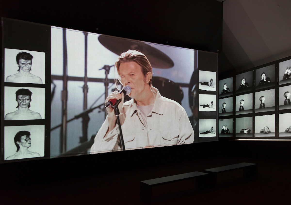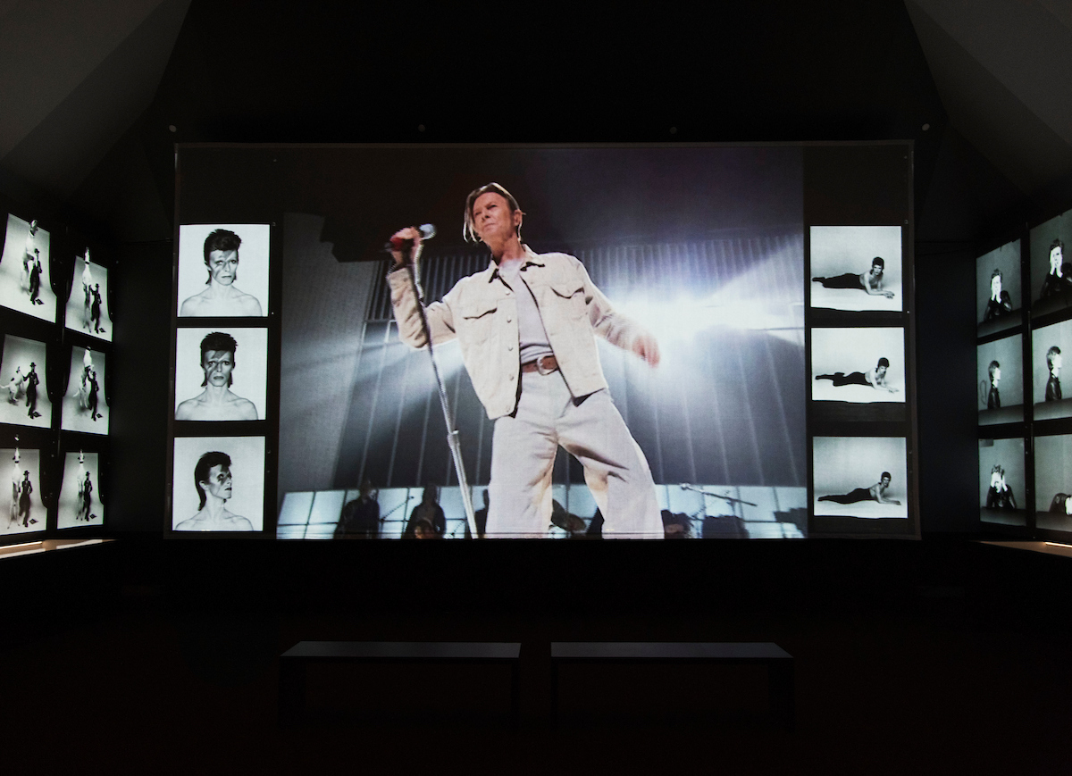 The audio played throughout, which viewer’s experience privately through separate headsets, also mirrors the break from chronology and linear structure. Composed and mixed by Bowie’s long-time producer Tony Visconti, the mix is a configuring of cut and rearranged clips sourced from the artist’s best known singles. The process applies the artist’s cut-up technique with the show’s contemporary posture. This lone hearing also gestures at the irreplaceability of music’s sensory pull.