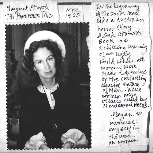Atwood is pictured as a sort of patron saint of Ferrato’s work; a circle behind her head in the 1986 photo emulates a halo, and Ferrato’s handwritten caption reads, in part, “I took Atwood’s book as a chilling warning of an ugly world….I began to immerse myself in the war on women.” In her 2021 book, Holy, spanning 50 years of her work — which was originally sparked by the 2016 election of Trump, and published just a few weeks after the January 6 insurrection — Ferrato is even more explicit: “[Atwood’s] book spoke to my core being. I became a soldier in the war on women. The camera, my weapon.”
