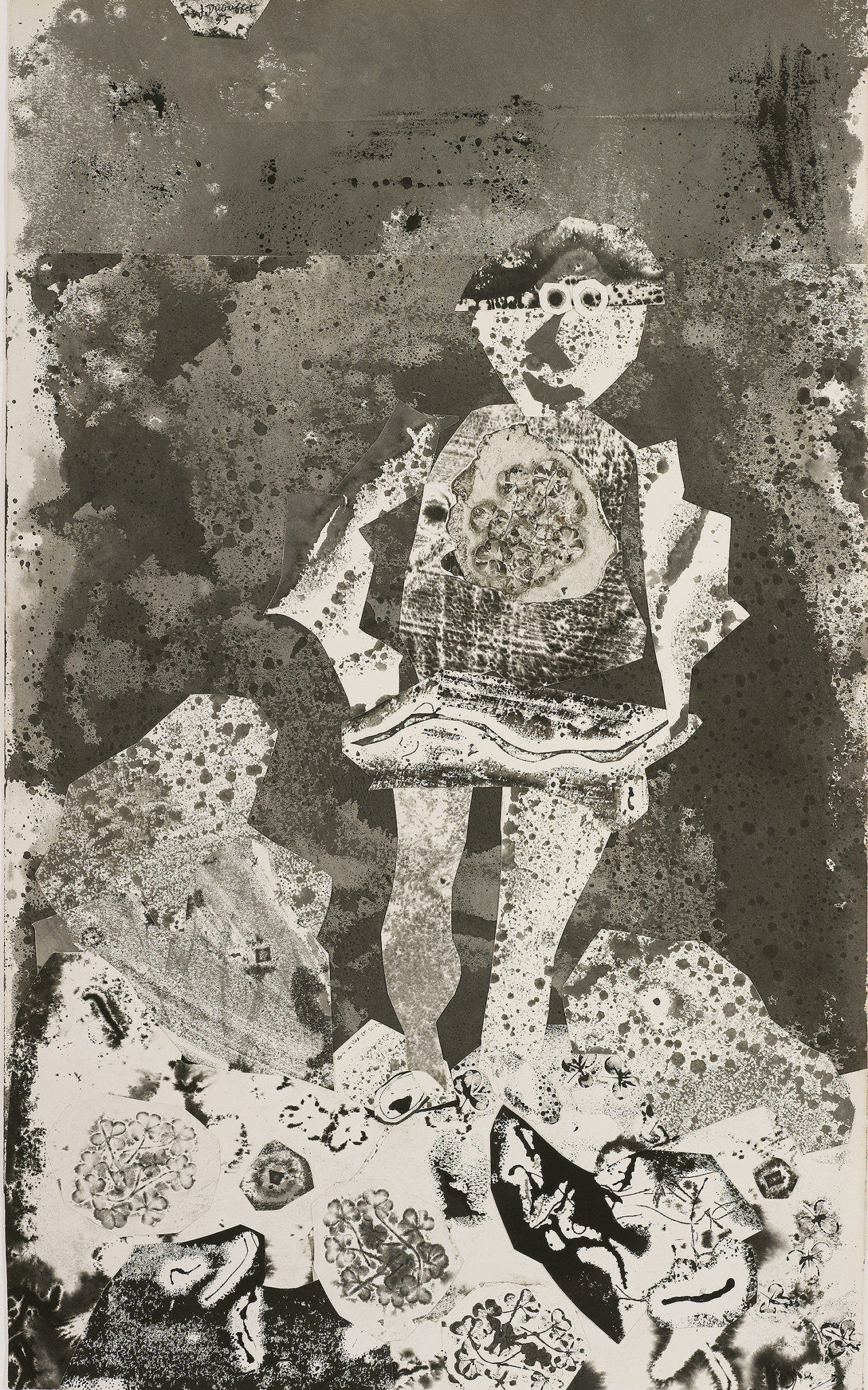By the mid nineteen-fifties, Dubuffet was focusing on dense surface manipulation and unusual textures. These often suggested a landscape, with a single figure isolated in it set against an inky dark sky. His work often combined the serious with the comic as in “Le Jardin de barbe (Beard Garden) (May 1959 assemblage of imprints, collage of cut and torn india-ink imprints, 20 1/8 x 13 3/8 inches). Here we see a frontal figure that resembles a children’s hand puppet, with large, deer-in-the-headlight eyes, a balding head and the eponymous beard.