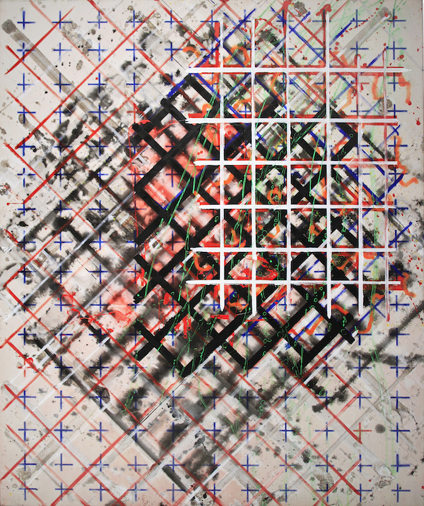 The background grid is the dominant image in “#3,” but electric blue and red squiggles, like strands of errant confetti dance, between the mannered lines like jolts of electricity. In the foreground, the colors of a pale fire in an unruly curve rise in thick chaos, as if dropped there from the sky.