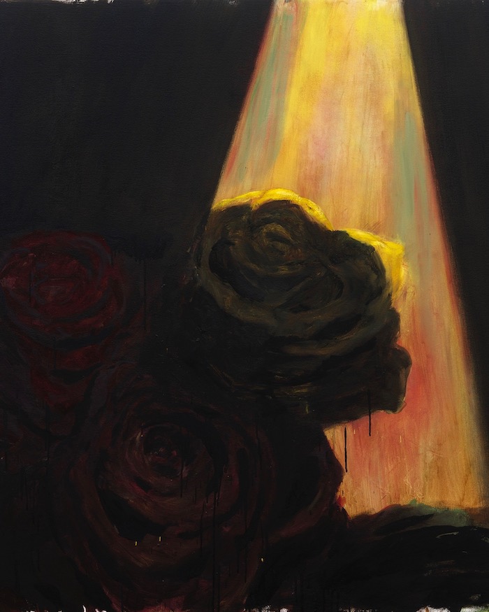However, in the Faithful, the reflected light of a full moon is here seen as an internal source of light that illuminates a dark painting which is a constructed world in itself. This melancholic painting, filled with the romance of flowers and the crisp, sharply delineated flight of white butterflies, is undercut by the uncertainty of conflicted feelings of loss, conveyed in the painting’s lower registers, amidst stated rise of hope in the upper thirds.
