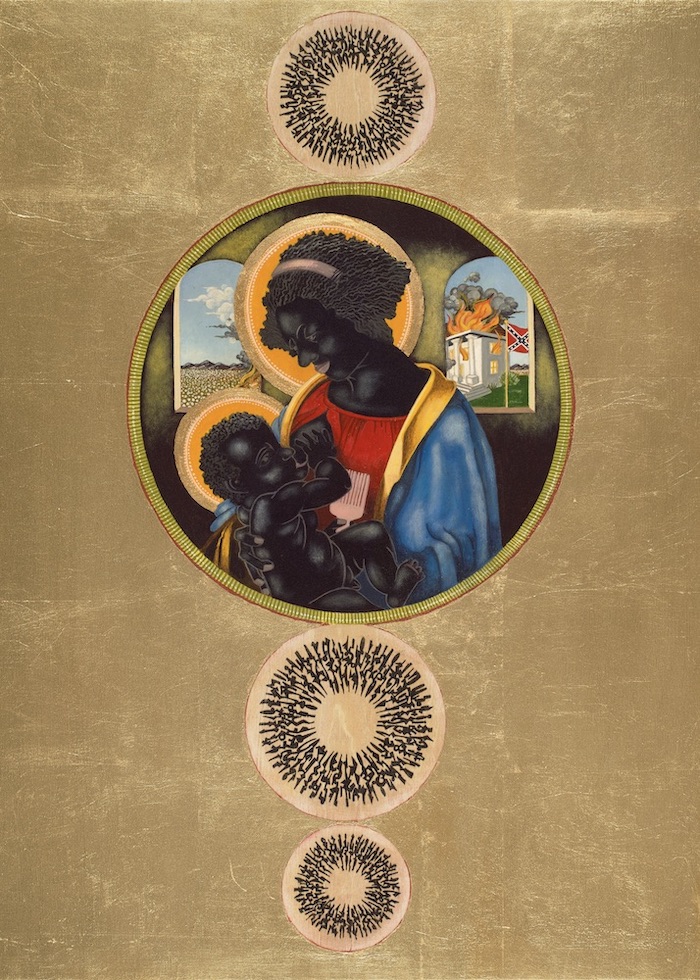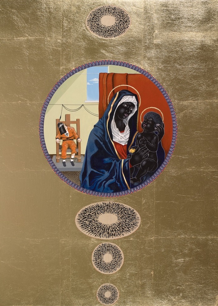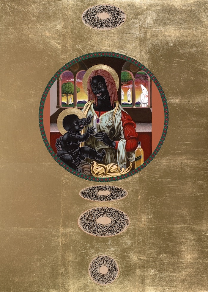 Greenfield’s meticulously crafted works are painted in a Byzantine style, using the circular tondo geometry surrounded by gold leaf and references to classical Madonna paintings by Da Vinci, Raphael and Bellini. His re-imagined Black Christ child is depicted laughing with his mother, wearing yellow sunglasses, holding a dynamite stick and clutching a cannabis leaf. In the background, white supremacists are cast as subjects for gruesome retribution — eye-for-an-eye payback for the flesh-and-soul warfare waged against Blacks since time immemorial. Hooded Klansmen, in these depictions, are strung up and precipitately torched. Antebellum plantations burn. Confederate monuments are toppled. Neo-Nazis are zapped by UFOs.