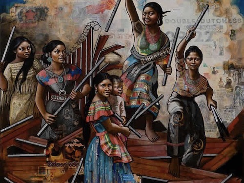 So when you paint a portrait that shows Indigenous women with their babies on their backs, dismantling the wall, that has real power behind it. The symbolic references that enter the mind are deeply affected by that kind of powerful imagery, much more then even words.