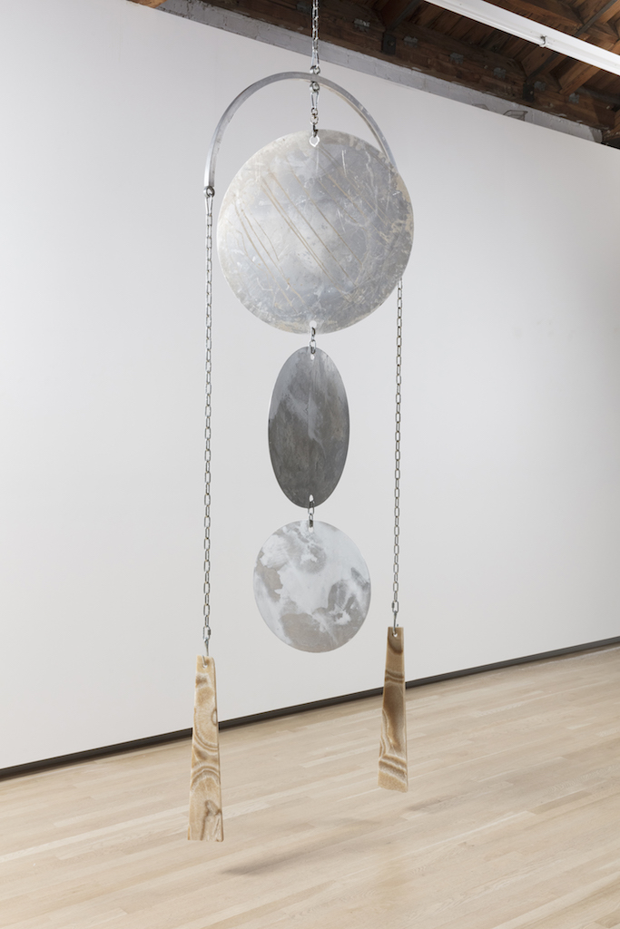 Continuing with this unification of opposing ideas, Ray’s other suspended work on display here, Dunes 2 Honeycomb (2018) centers upon ideas of serenity and chaos. Reminiscent of a wind-chime, a feminine trinket designed to make soothing sounds out of the turbulent breeze, this arch-shaped sculpture features two sizable silver chains with a slab of honey onyx dangling at each end. This variety of mineral echoes the surface of Venus in color and swirling design. While this planet dedicated to the goddess of love may seem temperate and paradisiacal, the viewer knows that this is simply not true. Modern astronomy asserts that Venus’s atmosphere is tumultuous, inhospitable, and rife of toxic greenhouse gases.