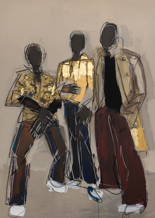 Incorporating a variety of “high value” materials into his paintings, including 24 karat gold leaf and velvet, Sheppard correlates blackness with beauty and dignity, implementing these materials in the service of the deeper content in his work, i.e., how the history of Black culture represents an ongoing reclamation of stolen identity and power. Blurring the lines between abstraction and figuration, Sheppard’s conscious choice to black out the features on each of his figures allows that the bodies and gestures take on new and unexpected meaning. As viewers, we are encouraged to take our visual cues from the information we see evidenced in the face, and so the fact there are no facial features to “read” forces us to look at the figure’s gestures and the clothes they are wearing to garner a deeper understanding of the overall painting.