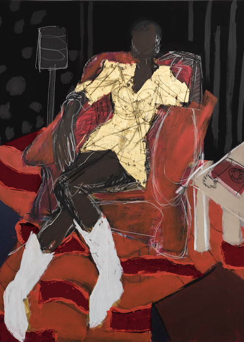 In works like “Me, Reggie and Tavares,” the artist positions himself among friends, dressed in oversized pants and golden shirts, facing forward as though posing for an impromptu photograph. The image is suffused with a sense of informality, and one has the clear sense these young men are comfortable with each other. Images like the irreverent and aptly titled “Put Some Red on It” showcases a young Black woman sitting in an overstuffed red chair. She wears white boots that appear more like cutouts in space, and once again the ubiquitous gold dress. This image in particular is seductive in a playful way, yet there is a seriousness here as well, as the face shows no emotion, only a smear of brown paint where one would expect to see a nose, a mouth and eyes. This strategy of abstracting the central image and denying the viewer the satisfaction of reading the image psychologically opens up the possibility for an alternative, and perhaps more metaphoric construal of the work. Questions come to mind like, who is this woman exactly, and what is her relationship to the surrounding space, specifically the brightly colored objects in the room? Sheppard offers no specific answers and, really, none are needed. It’s enough just to imagine the subtle and complex relationships that exist between the figure and her surroundings.