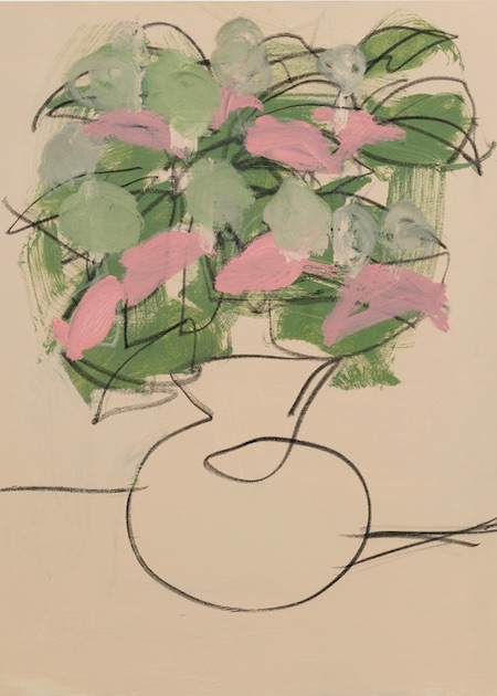 In contrast, the flower paintings in the second room are spare and uncomplicated, yet they too suggest a mind at work, searching for correlations and details to connect us with the natural world. In each Flower Study, the receptacle that holds the flowers is delineated with a single, spare line. This gesture operates in much the same way as Sheppard’s blotting-out of the faces, where the viewer cannot ground in contextual, visual bearing in terms of identifying with the subject, and instead must search for meaning elsewhere within the painting.