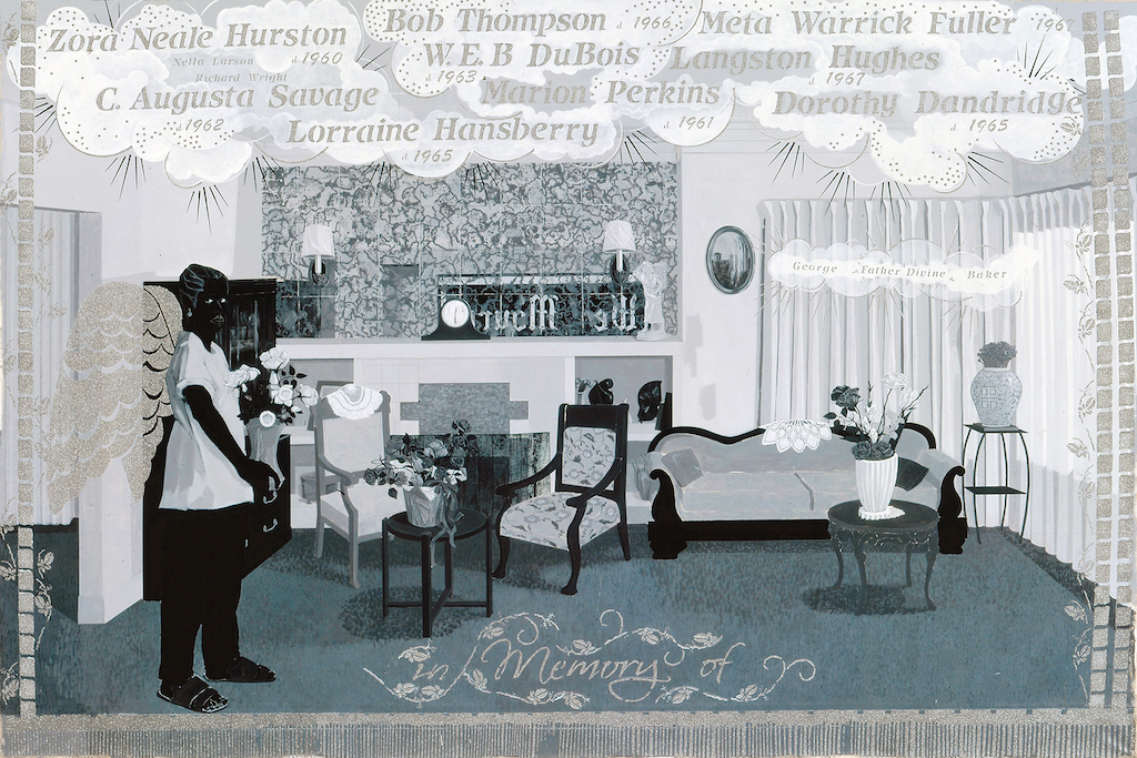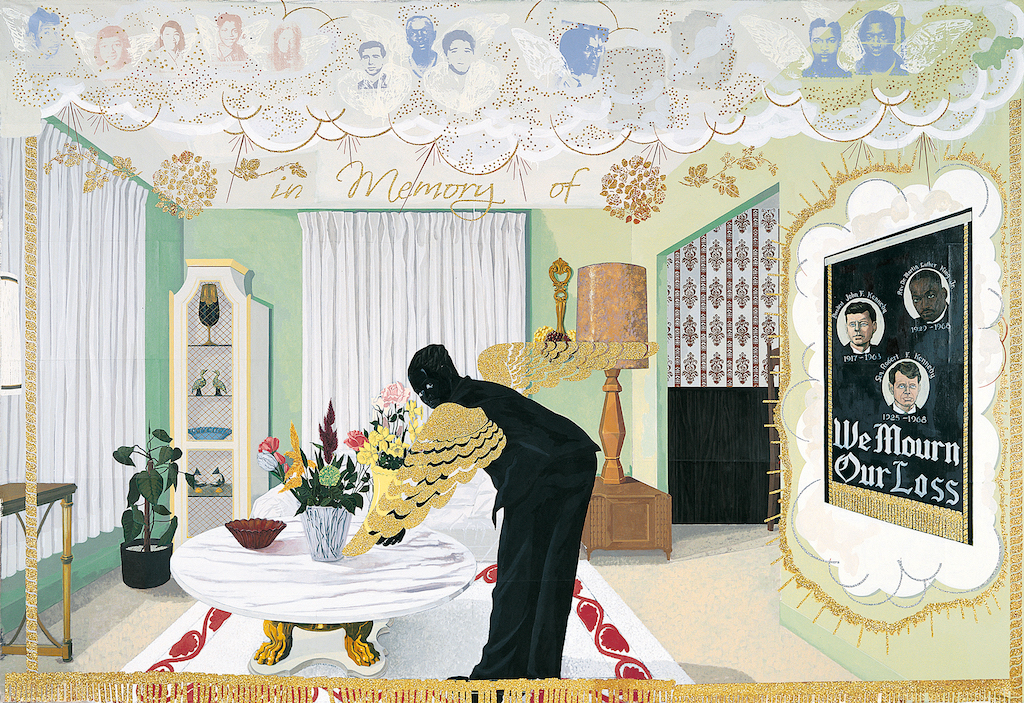 Kerry James Marshall’s stark, silhouetted figures set against brilliantly colored interiors or exteriors, exemplifies his ability to harness complex compositions and palettes. While simultaneously emphasizing his subjects and their environments, he masterfully constructs his paintings with a two dimensionality that is reminiscent of folk art or early American paintings. Marshall wants to engage with the viewer, to connect and make his intentions known. To this end, he has succeeded in making works that are inclusive of a larger audience as well as producing paintings so carefully crafted that they are stimulating, both visually and intellectually.