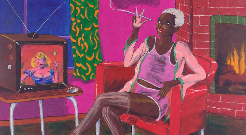 Thomas has, by her own admission, been influenced by such artists as Tom Wesselmann, Romare Bearden, and William H. Johnson. You can see their influence in her work, but she has come about her sexualized figures and abstracted interiors honestly. Her interest in installations and decoration evolved through her process.She begins many paintings by photographing models in her studio. Eventually this led to constructions of tableaux with furniture, lamps, wallpaper, textiles and wood paneling.The built environment became increasingly important, referencing memories of her grandmother’s and aunt’s houses and evoking a specific time period. Thomas began integrating her photo set pieces into her paintings and then eventually into installations that accompanied her shows. In Figuring History, there is an installation of a lounge in front of Ledéjeuner sur l’herbe, replete with carpet, seating, books and pillows. Thomas wants the viewer to be able to contemplate the work and participate in the installation at the same time. She hopes they imagine themselves in her interiors so that the viewer becomes the object of their own gaze.