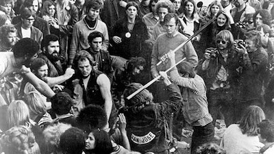 The HA’s beating a fan with pool cues at Altamont. In their unhinged and bacchanalian revelry, they also beat into unconsciousness Jefferson Airplane’s drummer Marty Balin, and during the Stones’ “Sympathy for the Devil” stabbed to death another fan. They Angels went on to pummel many in the crowd after one of their bikes was tipped. Mick Jagger said after the concert, “If Jesus had been there he would have been crucified.” The Hell’s Angels, it should be noted, were hired as “security” for the event.