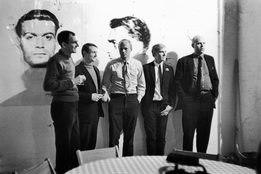 Pop artists Tom Wesselmann, Roy Lichtenstein, James Rosenquist, Andy Warhol, and ClaesOldenburg at Warhol’s Factory, 231 East Forty‑Seventh Street (its first location, until 1967), April21, 1964. Copyright Fred W. McDarrah, Courtesy Steven Kasher Gallery, New York