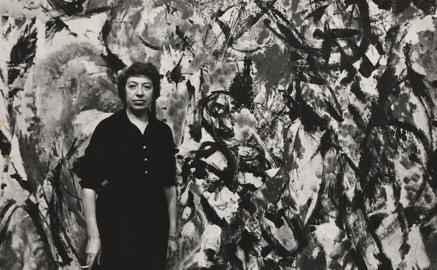 Abstract Expressionist artist Lee Krasner, who was married to Jackson Pollock, in front of one of her paintings, February 26, 1961. Copyright Fred W. McDarrah, Courtesy Steven Kasher Gallery, New York