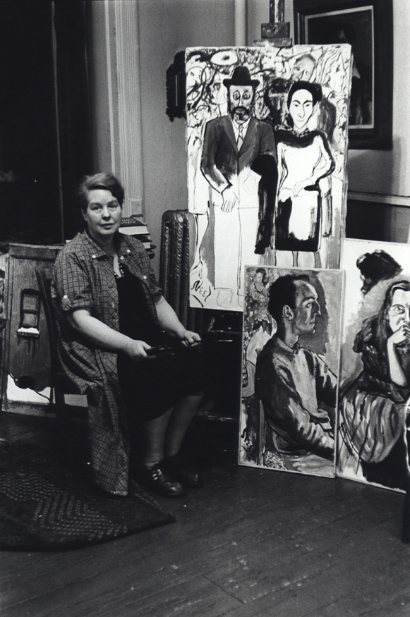 Alice Neel in Her Studio, East Harlem, with Milton Resnick, Pat Passlof and Frank O’Hara in Paintings, February 1, 1961. Copyright Fred W. McDarrah, Courtesy Steven Kasher Gallery, New York