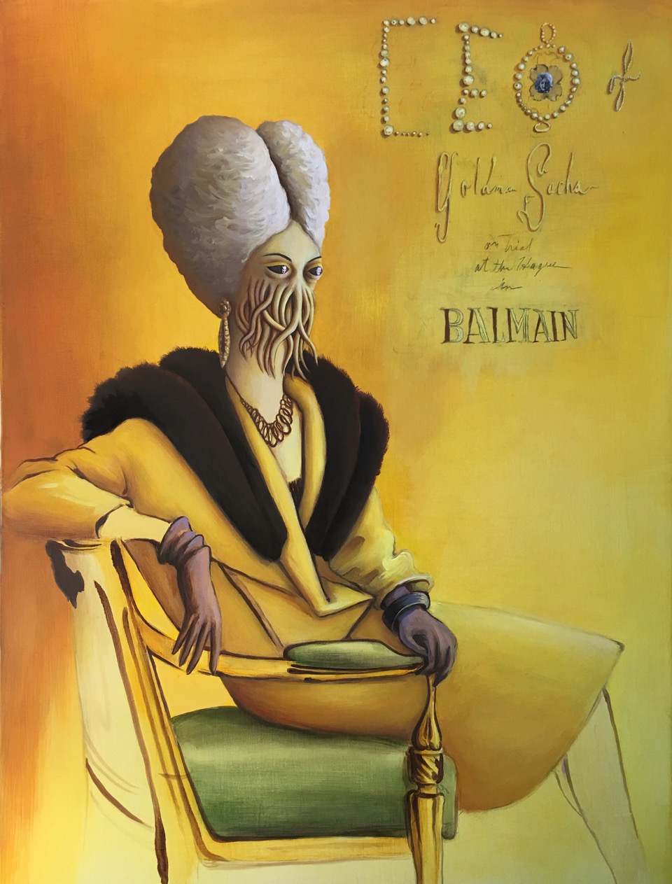 Another equally unnerving category of this psychic trauma is seen in Deen’s historically-based fashion illustrations and society portraits. Oozing glamour, the women depicted here are dressed in their fineries. However, they all feature a monsterous characteristic, such as alien-like tentacles dangling from their noses or a zombified face. We can see these tentacles in CEO of Goldman Sachs on Trial at the Hague in Balmain (2017). Inspired by 1950s fashion illustrations of Rene Bouche, this painting centers on an elegant older woman with a Marie-Antoinette-esque hairdo defiantly staring down the viewer and her critics. Also through Deen’s zombified woman depicted in Closed for renovations. Thank you for your continued patience ~ The Management in Pierre Cardin (2017), we see that women can also be complicit in these wrongdoings. By portraying these emblematic women as monsters, she allows us to question their humanity.