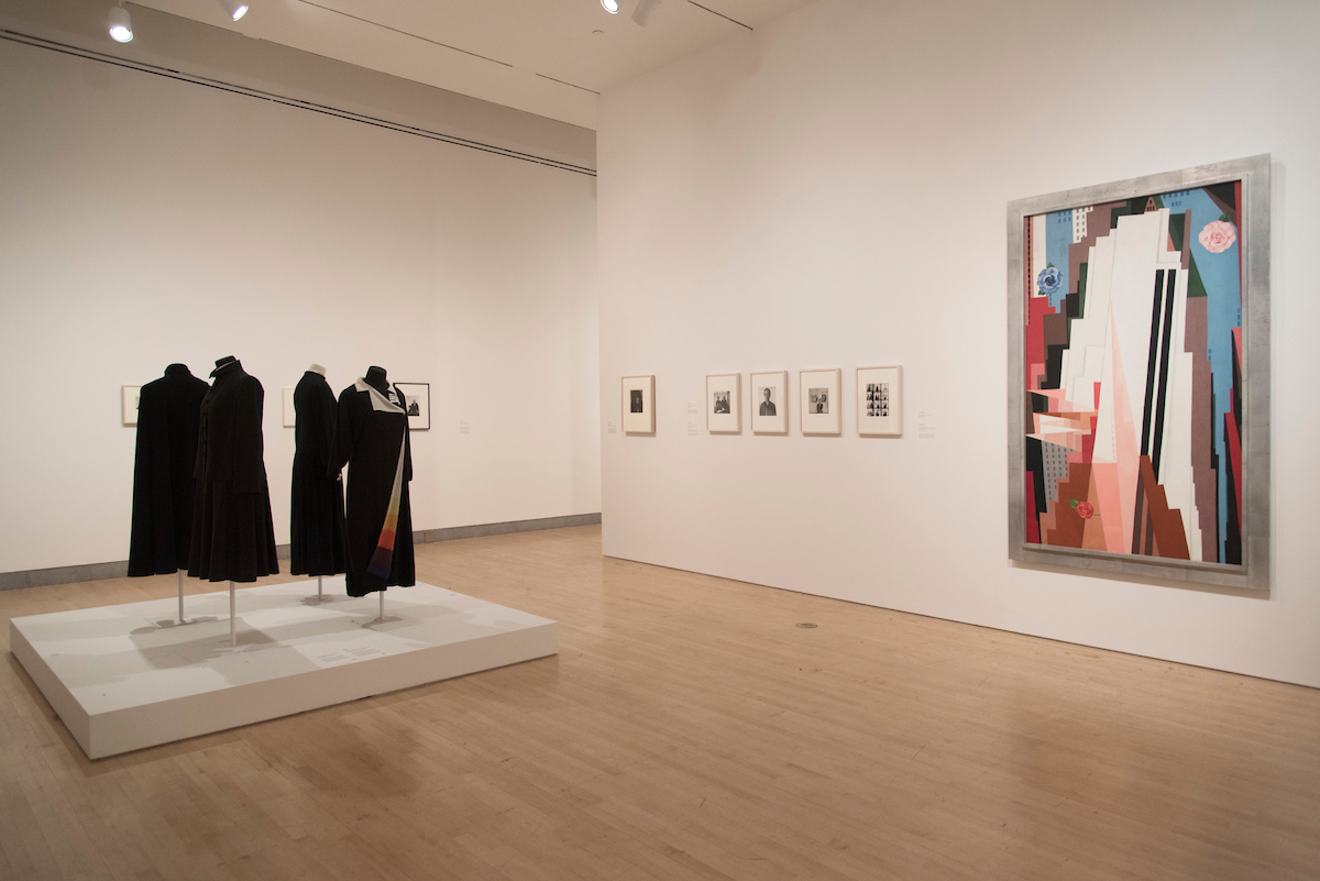 Other portraits, from 1918 through 1932, show something of the evolution of Stieglitz’s and O’Keeffe’s collaborative stylization of her image, which she continued to actively refine and distill into a personal brand, extending it to her furnishing and homes, for the rest of her life. Her clothing of the time, blouses and dresses that she designed and sewed, starts out simple and primarily white, its only adornments delicate pleats and ruffles. The art in this room includes just a single of the more familiar-looking floral images, a slightly suggestive Jack in the pulpit. There are several paintings of shells, of autumn leaves, a striking image of the Brooklyn Bridge, and an abstract vision of 1932 Manhattan. A stunning black belted dress, and a dramatic cape by Zoe de Salle, displayed center stage, could best be described as Quaker meets Paris.