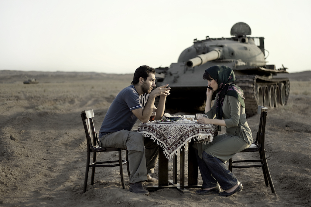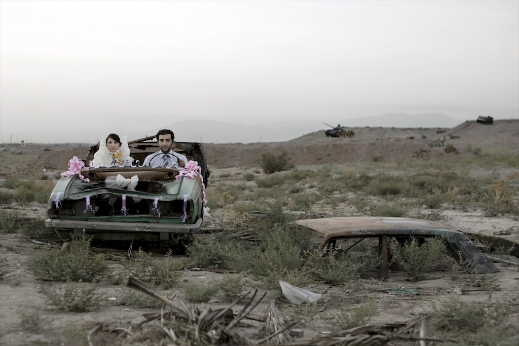 In the photo series “Today’s Life and War” (2008 – that is, exactly contemporary with Ghadirian’s “Nil”) Dashti sets her protagonists adrift on the battlefield (the best they can do for a house is a bunker padded with sand-bags) where they must attempt to reconstitute the routines and rituals of daily life within a blasted and war-scarred landscape: they set off from their wedding in the junked remains of a car gaily decorated in pink; they attempt to converse over tea under the watchful “eye” of an abandoned tank’s cannon, etc.[23]