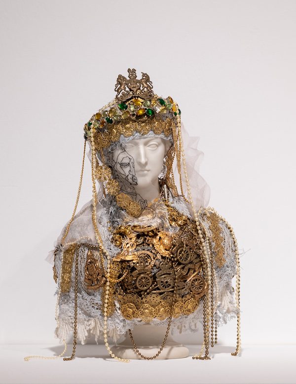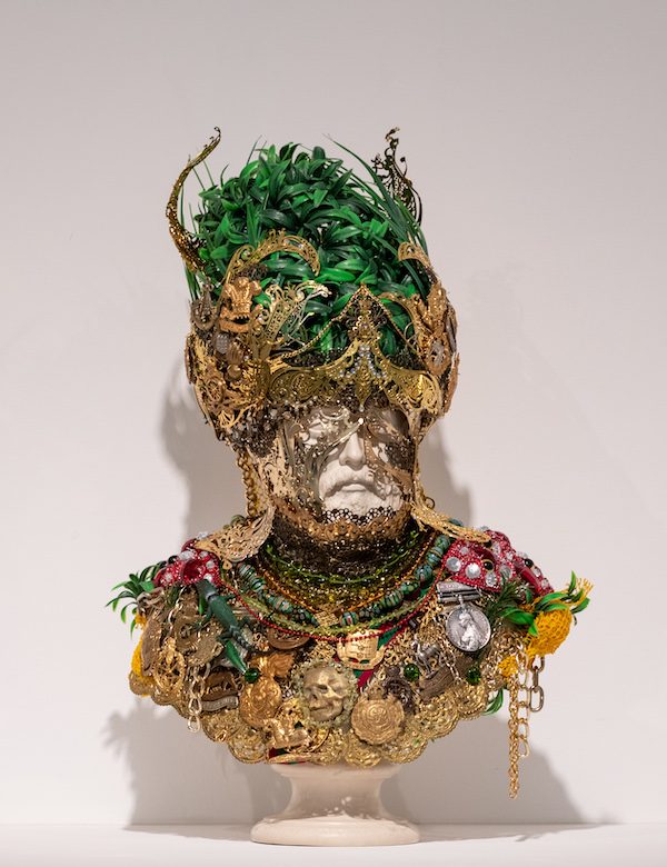 Other statues — busts representing members of the British Royal Family (Queen Victoria, Princes Alexandra and Edward VII) — make up a series of works titled Souvenirs (2018-19). Locke has ornamented these busts with a collage of military medals, metal masks, lace, plant foliage and cowrie shells (widespread as a currency during the slave trade). The dressing up of these royal rulers in a bizarre regalia is clearly a subversive act, and a refutation of the ‘deadness’ of history. For Locke, it seems, past and present can share the same space.