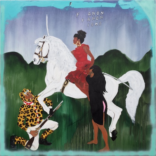 And then there are Rashid’s monumental history paintings (see installation view below). These works line the room and connect the epic from one wild story to another. There are two group portrait paintings in the show, wherein Rashid highlights three central figures in works such as F Anon Is Me (Fanon isme as an answer to the scourge of colonialism) However, sometimes it is difficult to get to the ringleaders atop the pyramid and one must be satisfied by dispatching proxies. Ultimately, a wasted effort. Or, red woman on a horse. With this title and a seemingly simplistic word play, Rashid brings the past to the present, poking fun at QAnon and referencing postcolonial theorist Franz Fanon in the same blow. The Indigenous “Fanonist” women in the painting fight back against the jaguar soldier who had previously subjugated them. As Rashid explains in his statement for the show, “only the proletariat was in any position to fight the system effectively, a fight that Fanon determined would have to be violent because it was born of violence.” Given that Rashid’s work and entire imperial saga is steeped in and informed by postcolonial and decolonial theory, this reference is layered and complex, offering viewers who are willing to play an opportunity to learn from and engage with history.