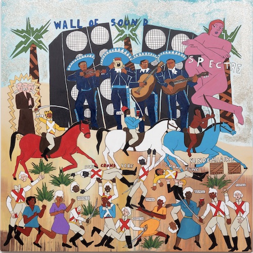 Finally, in some of Rashid’s remaining paintings there are a cacophony of characters, colors, and historical mashups. Afrofutrist references to Egyptian art and symbology dance with European space stations, Transformer robots, Mariachi bands, and playful but violent colonial vengeance on Franciscan priests left to the fate of the conversion machines that mimic torture devices of the Spanish Inquisition. These are densely packed paintings with numerous narratives and morals lined throughout. In The Battle of Coachella Part 1. Day 1. and Part 2. Day 2. (full titles are in the captions below), Rashid throws so many absurdist elements at the viewer that it might take days to unpack, track, and understand them all.