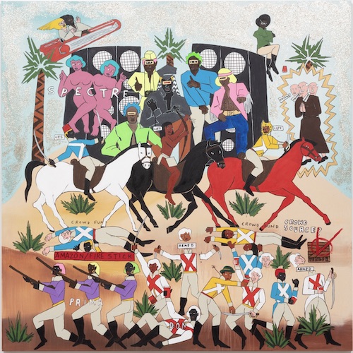 In another work (titled Devastating Armaments Resistance Enterprise. Or, if we must die, let us be drunk and high. When one has given up and defeat is certain, it appears that the numbing of the senses can be a balm of sorts. It is not recommended however. War is wealth. Is entropy an enterprise?), Rashid paints three more central figures with one sitting atop a black horse, casting a sword down at two people below. The woman brazenly chugs champagne from a bottle while the man smokes a joint. Across the painting, the letters “D.A.R.E.” are emblazoned in familiar handwriting, spray painted in red. The title’s first four words form an acronym that doubles by referencing the Reagan Administration’s war on drugs and their Drug Abuse Resistance Education program, known more commonly as “DARE” in the 1980s and aiming “to keep kids off drugs.” This is what Rashid calls “a let them eat cake moment” as the white colonialists party obliviously, meeting their demise when a Black rebel soldier attacks.