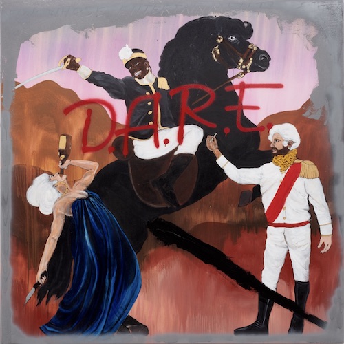 In another work (titled Devastating Armaments Resistance Enterprise. Or, if we must die, let us be drunk and high. When one has given up and defeat is certain, it appears that the numbing of the senses can be a balm of sorts. It is not recommended however. War is wealth. Is entropy an enterprise?), Rashid paints three more central figures with one sitting atop a black horse, casting a sword down at two people below. The woman brazenly chugs champagne from a bottle while the man smokes a joint. Across the painting, the letters “D.A.R.E.” are emblazoned in familiar handwriting, spray painted in red. The title’s first four words form an acronym that doubles by referencing the Reagan Administration’s war on drugs and their Drug Abuse Resistance Education program, known more commonly as “DARE” in the 1980s and aiming “to keep kids off drugs.” This is what Rashid calls “a let them eat cake moment” as the white colonialists party obliviously, meeting their demise when a Black rebel soldier attacks.