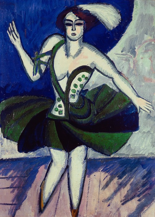 That dream of escape corresponds to a larger ambivalence about modern life — an ambivalence shared by the entirety of German Expressionism. It shows even in Dresden, with his early sharp contrasts and thick brushwork. A male portrait approaches a side of beef twenty years later for Chaim Soutine, who would have appreciated a studio in a butcher’s shop. Tightrope walkers seen from above seem to be walking unsteadily on the ground. Colors keep clashing, while dancers wear pink against a field of pink that refuses to match up. A woman at a dressing table looks ordinary enough, but her reflection in a titled mirror leaves everything awry.