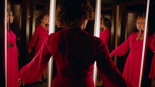 To his credit, the film’s colors are fantastic. Alluding to the vicious hues of giallo, In Fabric’s reds are so violent they nearly bleed. A frank sensuality is displayed through close-ups of blood-red lacquered fingernails stroking fabric, the moaning mouth of an orgasmic woman, and the stark spray of semen from an unashamed voyeur. Shiela’s styling and the film stock aesthetic has a sixties vibe ’60s, while the boutique’s embellishments — like the shop girls’ uniforms — feel older, wilder, and fittingly festered. Underscoring this nostalgic mystique, Strickland offers Cavern Of Anti-Matter’s eerie yet enchanting score, where a harpsichord lets out tempting tinklings and low-brooding warnings. Add to this the sound design that swells with throbbing whispering of women, and In Fabric feels like its swallowing you whole with its sounds and sensations.