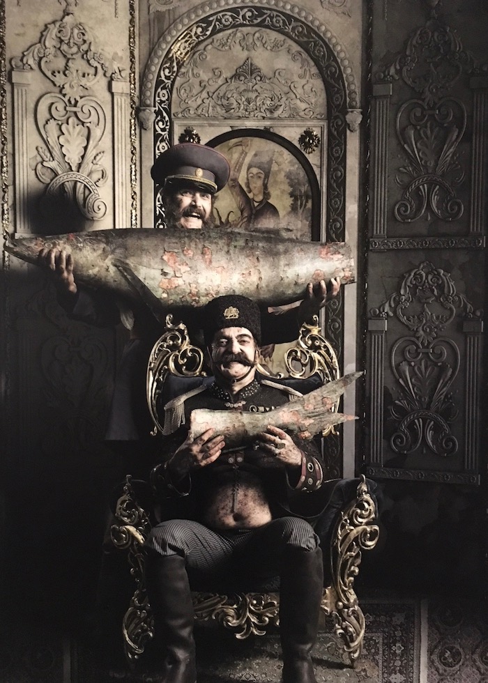 Each of these highly theatrical works has been staged with costumed actors (some covered in dried mud) engaging in dubious and mysterious activities in a highly decorated palatial space. The gender fluid protagonist (The Shah) is dirt covered and scratched (crawling through the metaphorical underground can make you literally and figuratively “dirty”) appears as the central figure in most of these complex tableaux that are redolent of decay and decadence. The Shah” appears wearing Fredrick’s Of Hollywood sexy lingerie and is presiding over a circus-like, rusting, and chaotic palace. This crammed space is populated with white rabbits (a reference perhaps to the unreality of Alice In Wonderland), chickens, a debauched looking British Ambassador dressed as a ringleader wielding a whip, a Russian ambassador proudly holding the larger part of a dead fish, disembodied heads on a platter, a middle aged white clad chubby angel, provocative women of the night, multiple armed assassins along with other fascinating characters, too numerous to discuss.