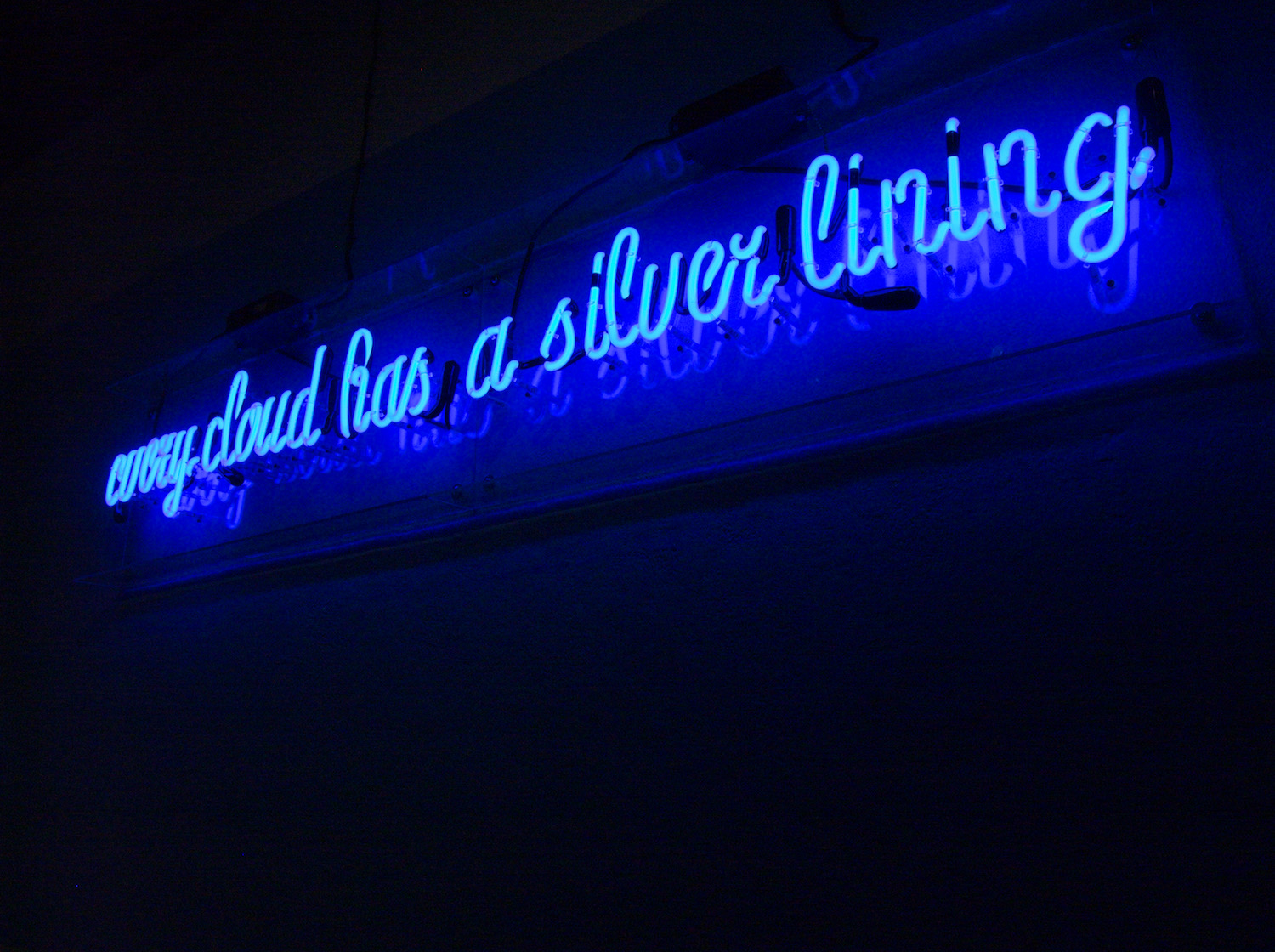 Many years ago, we made a neon piece titled Every Cloud Has a Silver Lining. The title was part of the piece itself, which was an installation at Ohio University [from the exhibition Hope Springs Eternal]. It encompassed three of the walls, so it was hundreds of feet long. It was a landscape of clouds, with a cloud at the beginning that was raining, like a big storm cloud. There was a little model plane that had seeded the clouds. Text is there, in the past, but not like Thomas Müller. He uses text for all of his pieces now. It’s less prominent in our work.