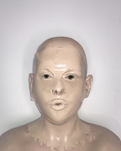Layers of cream texture and oils used on latex face mask to create a smooth surface.