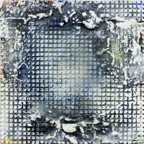 It may be this almost cosmic sense of the universal, or perhaps it’s his unique use of medium that feels so rich, resonant, and mysterious. Viewers may, at first glance, perceive that the mosaic-like works as made from mosaics, or beads of glass. But in reality, the material the artist uses is acrylic paint. Paint poured thick, cut, and then glued to the canvas. Strange, meticulous, a bit surreal, the individual paint pieces are dissected, re-set, like gemstones cut to fit a jeweler’s mold.