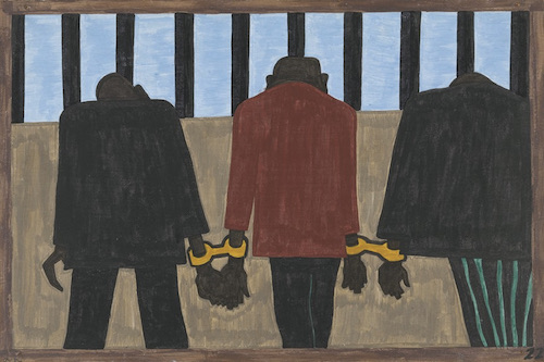 When Lawrence eventually decided not to continue with the Struggle series, he also turned away from the fierce emotions and sometimes austere, restrained color of the work. Although his drawing style continued to evolve, and future scenes might be comprised of innumerable tiny, interlocking elements, he left behind, too, the compressed Cubist-and-Expressionist style he created for his Struggle pictures. And while he continued to include now and then figures with white faces in his pictures—his many scenes of carpenters often show Black and white workmen on the same job—he did not again give central positions in his scenes to white people. In many ways, Struggle represented a momentary transformation of his art.