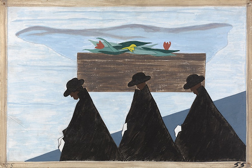 He planned to have the projected sixty works completed by 1956, but by then he had done only thirty, and it was thought to show this first half that year. But perhaps because the possibility of a single buyer was at first remote—he very much wanted them to stay together—he did not continue. (They have not stayed together.) Maybe he felt that he had said enough. Much as one would like to know how he would have handled his projected next large topics—the Civil War and industrialism—the pictures in the Met’s show, which was organized by the Peabody Essex Museum in Salem, Massachusetts, feel like a full story in themselves, in part because they do not add up neatly. In many instances, Lawrence’s meanings are elusive.