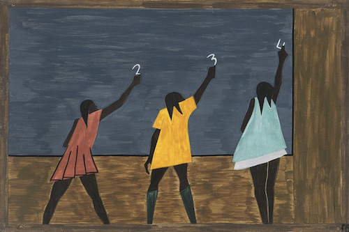 The early 1950s must have been for him as a painter a time of upheaval, or at least serious questioning. Like some other artists who matured in an earlier time, he had been sheltered from the waves of new, often abstract art coming from Europe. But New York, Lawrence’s city, had become the headquarters of the art world’s latest development, Abstract Expressionism, and the notice taken of it was widespread and insistent. Lawrence’s own approach—he worked representationally, making small pictures on paper or board—might easily have been seen as timorous in relation to the new large abstract canvases of Willem de Kooning, Jackson Pollock, and the others. And how he responded as an artist was bound to have some effect. He was a public figure, and one who carried a certain responsibility on his shoulders. He was already then (and would long continue to be) our foremost African-American painter.