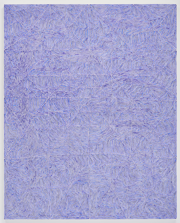 Concordulation (2017), consisting of undulating lines in shades of red, has a biological aspect, like the enlarged image of a blood cell, or the circulatory system of an alien creature. Converbatron (2018), made up of dense but delicate lines in shades of periwinkle, divided by large ethereal X-marks, radiates a soft luminescence. Percussilative Echo, (2017-2018), looks like an azure map of oceanic currents, and Ssonsunurrhth (2018), is equally cobwebby and electronic. Because of their size — the largest, Tnonde, measures about 91 by 70 1/4 inches — these striking works have a strange heraldic quality—like space-age tapestries or intergalactic flags.