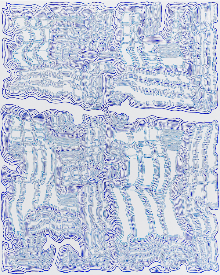 Whether monochromatic or in several complementary colors, whether thick or thin, the elastic, endlessly-repeated, carefully-executed ribbons of paint (first outlined in charcoal or graphite), produce varying optical affects. Some look like the whorls in a tree trunk’s cross-section, others like a circulatory system, still others like cobwebs, or a river’s tributaries.
