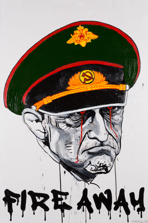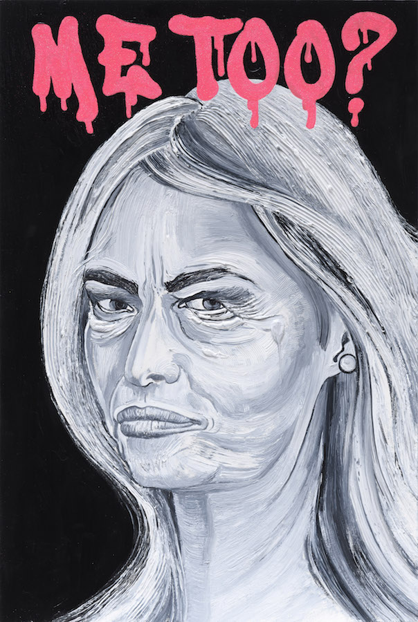 As political statements, there is no argument that the work of Carey and Conal are most effective when experienced as they were originally intended. When Carrey harnesses his outrage in a timely response to current events on Twitter, he maximizes the attention they receive. Likewise, Conal’s posters papered onto city walls are the direct descendants of historical political cartoons and Early American broadsheets. The urgency inherent in both mediums successfully conveys the message better than any gallery show is able to do. However, there is a real pleasure in seeing these works in the context of a gallery because as paintings and drawings they each possess an energy and artistry not easily communicated through posters and iPhones. There is also value in acknowledging and appreciating the artists’ efforts that they make at some risk to themselves. Is this burgeoning branch of the resistance in time to effect change? It is impossible to know, but hats off to the artists who are willing to claim the emperor has no clothes, except perhaps for a very long red tie.
